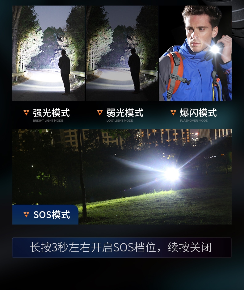 聚光主燈 亮度隨心 輕按后端開關按鈕,主燈強光點亮,續按依次切換主燈工作光-爆閃光。主燈開啟狀態下長按5秒,可實現光源色溫轉換。主燈關閉狀態下長按5秒,可開啟燈具最亮照明模式。 爆亮強光 亮如白晝 1500LM大功率高亮光源,點亮頃刻如白晝