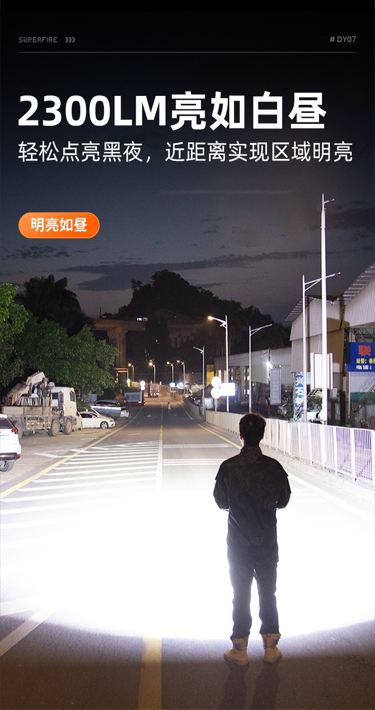 聚光主燈 亮度隨心 輕按后端開關按鈕,主燈強光點亮,續按依次切換主燈工作光-爆閃光。主燈開啟狀態下長按5秒,可實現光源色溫轉換。主燈關閉狀態下長按5秒,可開啟燈具最亮照明模式。 爆亮強光 亮如白晝 1500LM大功率高亮光源,點亮頃刻如白晝