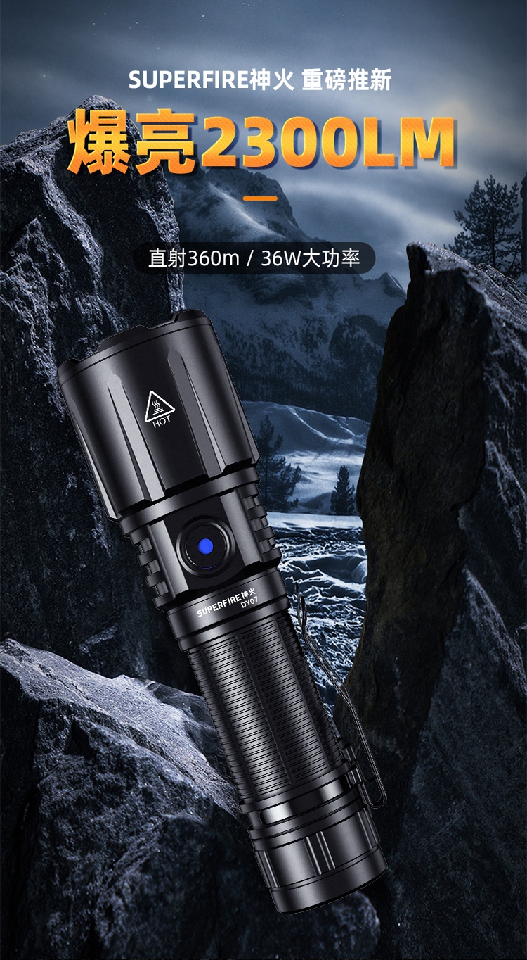 1、千米遠射,射程更遠,光斑更聚焦。 2、進口燈珠,亮度高,照明效果更好。 3、前后雙按鍵,光源一鍵點亮,高亮瞬間開啟。