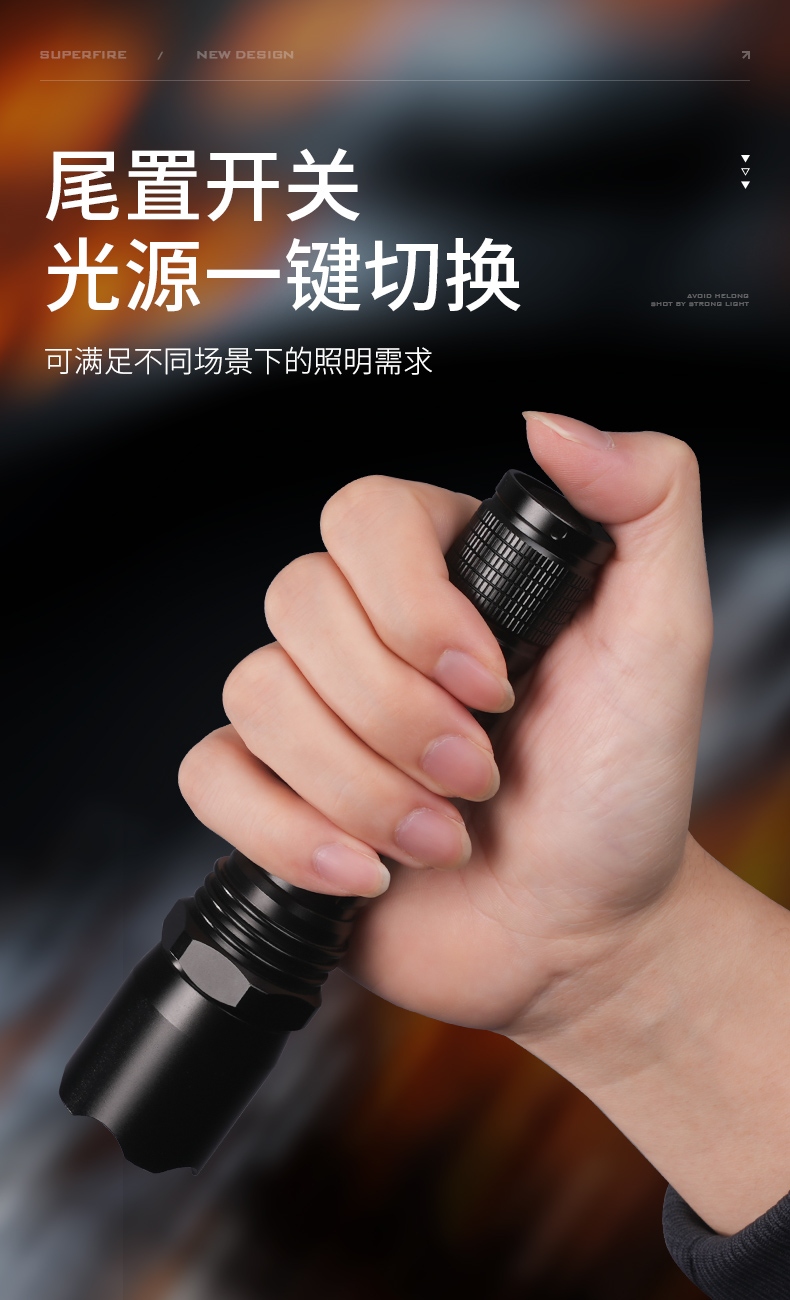 1、3檔調(diào)光,可滿足不同使用場(chǎng)景下的照明需求。 2、多種安全程序,可有效保護(hù)手電使用安全,延長(zhǎng)手電使用壽命。 3、精致外觀,時(shí)尚小巧。