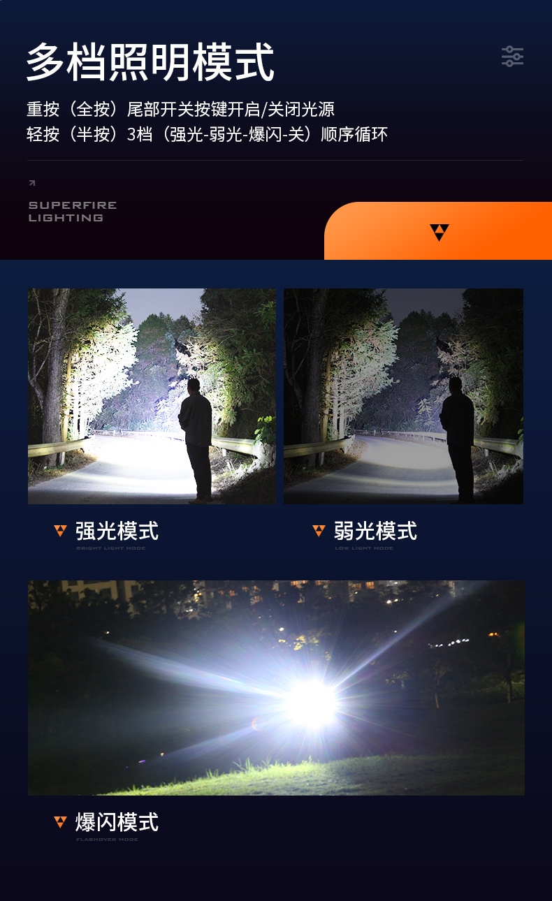 聚光主燈 亮度隨心 輕按后端開(kāi)關(guān)按鈕,主燈強(qiáng)光點(diǎn)亮,續(xù)按依次切換主燈工作光-爆閃光。主燈開(kāi)啟狀態(tài)下長(zhǎng)按5秒,可實(shí)現(xiàn)光源色溫轉(zhuǎn)換。主燈關(guān)閉狀態(tài)下長(zhǎng)按5秒,可開(kāi)啟燈具最亮照明模式。 爆亮強(qiáng)光 亮如白晝 1500LM大功率高亮光源,點(diǎn)亮頃刻如白晝