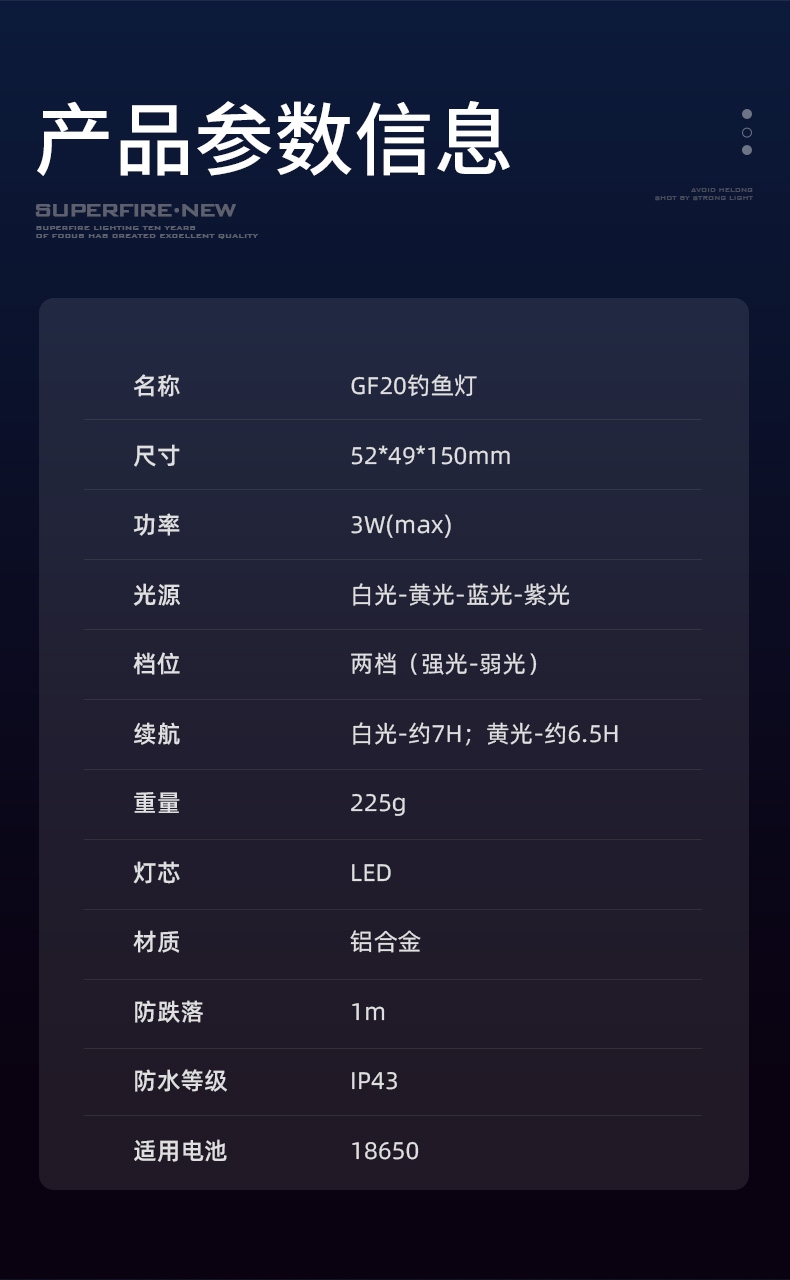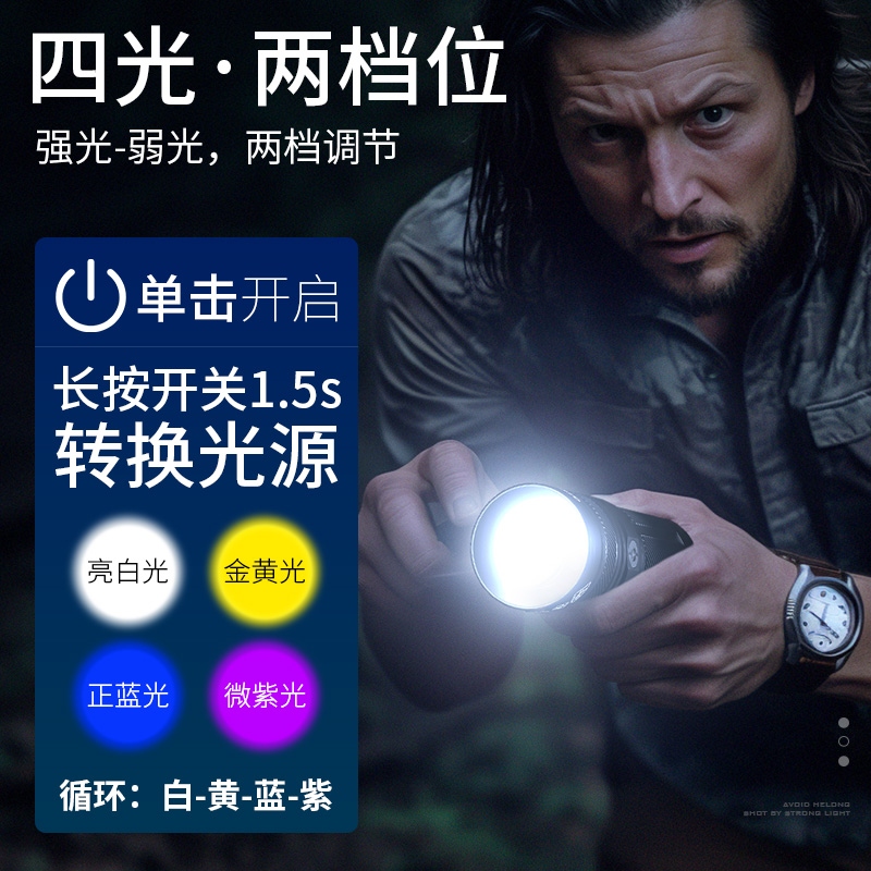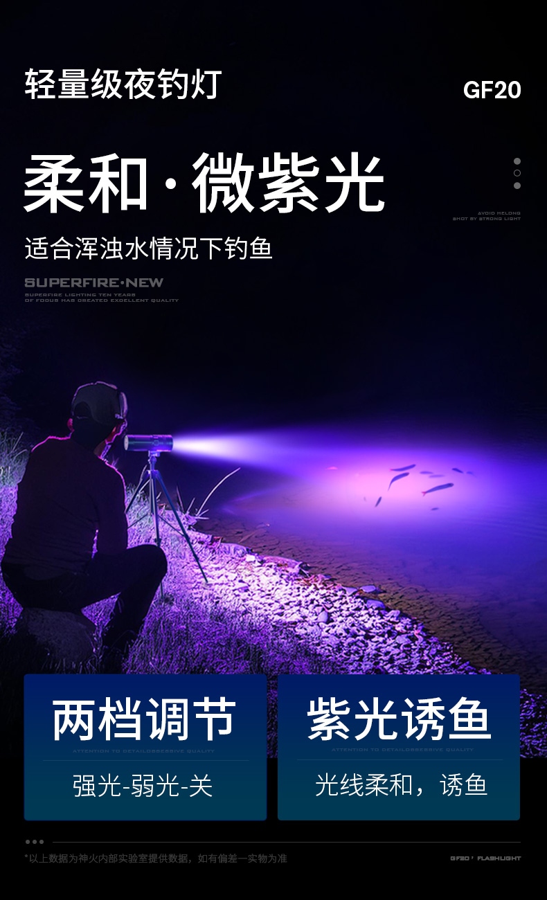 1、兩檔調光,滿足不同場景使用需求。 2、伸縮調焦,光斑大小可隨意調節,使用更方便。 3、紫藍黃白四色可變光源,可任意切換,夜間垂釣看漂更顯目。