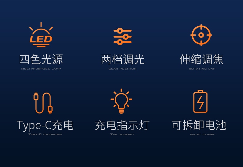 強光亮度,運動頭燈,前后均衡設計,輕便不壓頭,可調節式頭燈帶,佩戴方便舒適,伸縮調焦,光照范圍大,照射距離遠,頭燈角度調節,超90度角度隨意調節,適宜各種環境使用