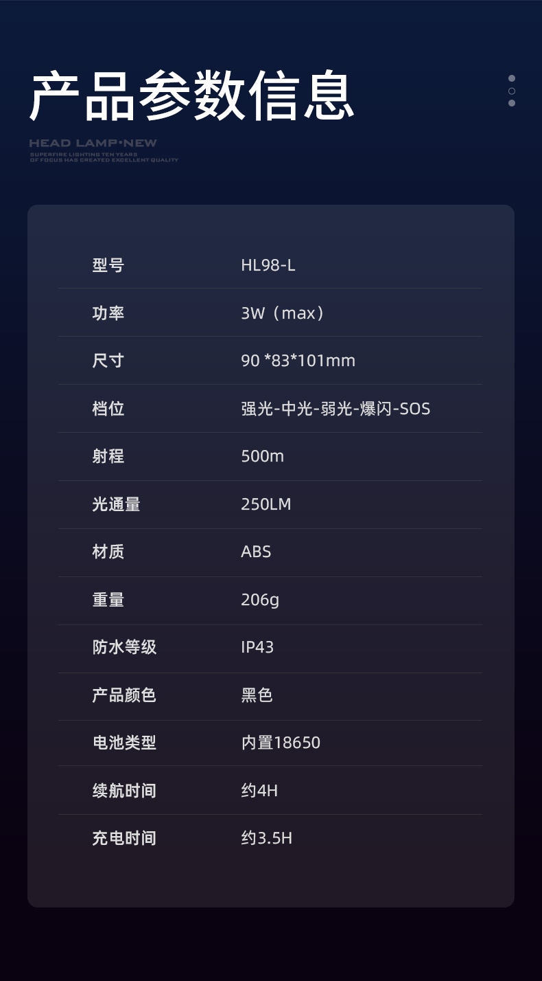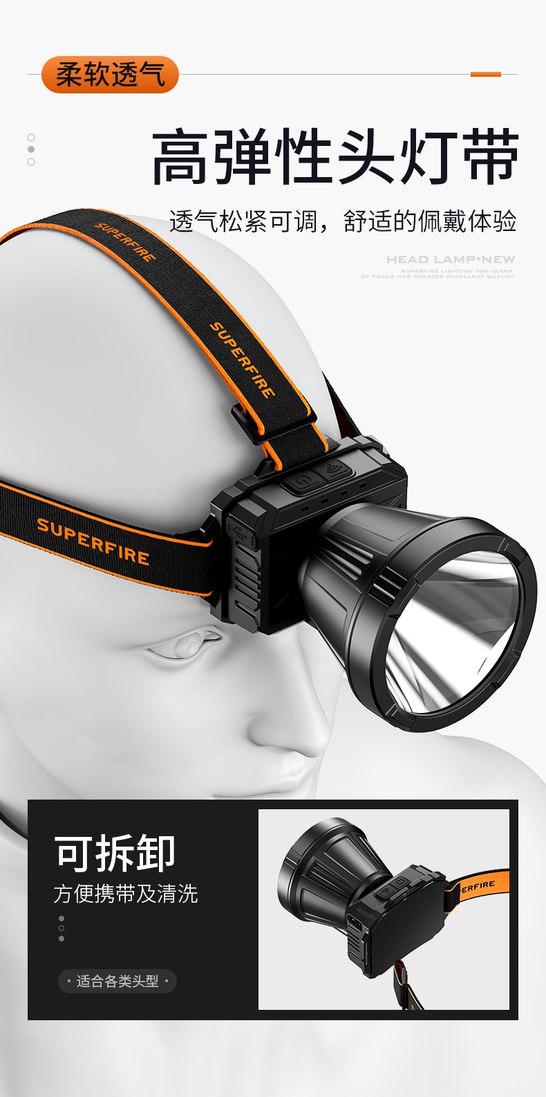 強光亮度,運動頭燈,前后均衡設計,輕便不壓頭,可調節式頭燈帶,佩戴方便舒適,伸縮調焦,光照范圍大,照射距離遠,頭燈角度調節,超90度角度隨意調節,適宜各種環境使用