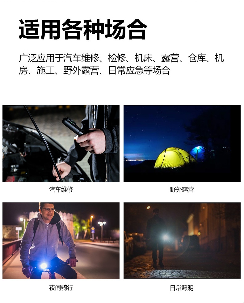 1、多檔調(diào)光,可滿足不同使用場景下的照明需求; 2、含提手,握感更舒適。攜帶更簡單; 3、新型高亮遠(yuǎn)射燈珠,60W大功率,亮度高,照明效果好。