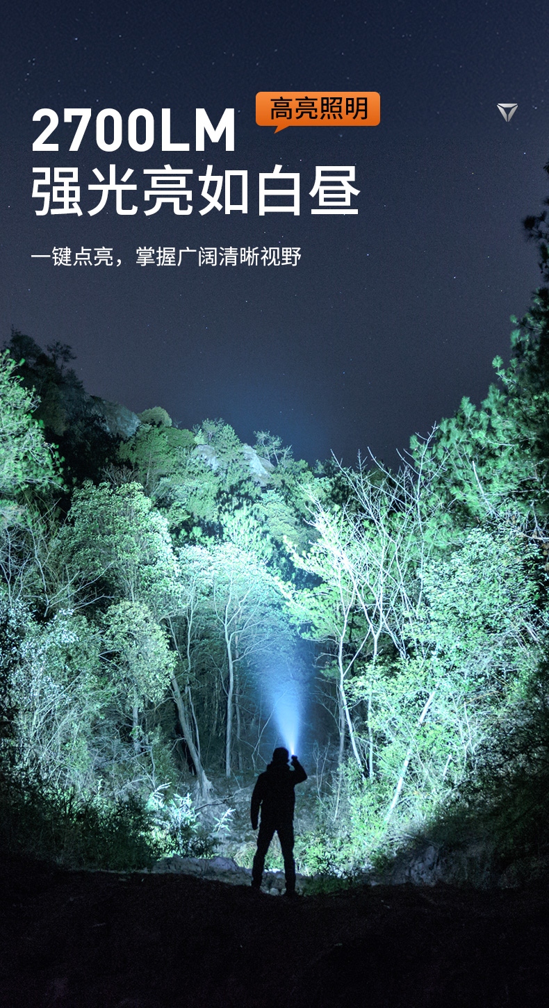 聚光主燈 亮度隨心 輕按后端開關按鈕,主燈強光點亮,續按依次切換主燈工作光-爆閃光。主燈開啟狀態下長按5秒,可實現光源色溫轉換。主燈關閉狀態下長按5秒,可開啟燈具最亮照明模式。 爆亮強光 亮如白晝 1500LM大功率高亮光源,點亮頃刻如白晝