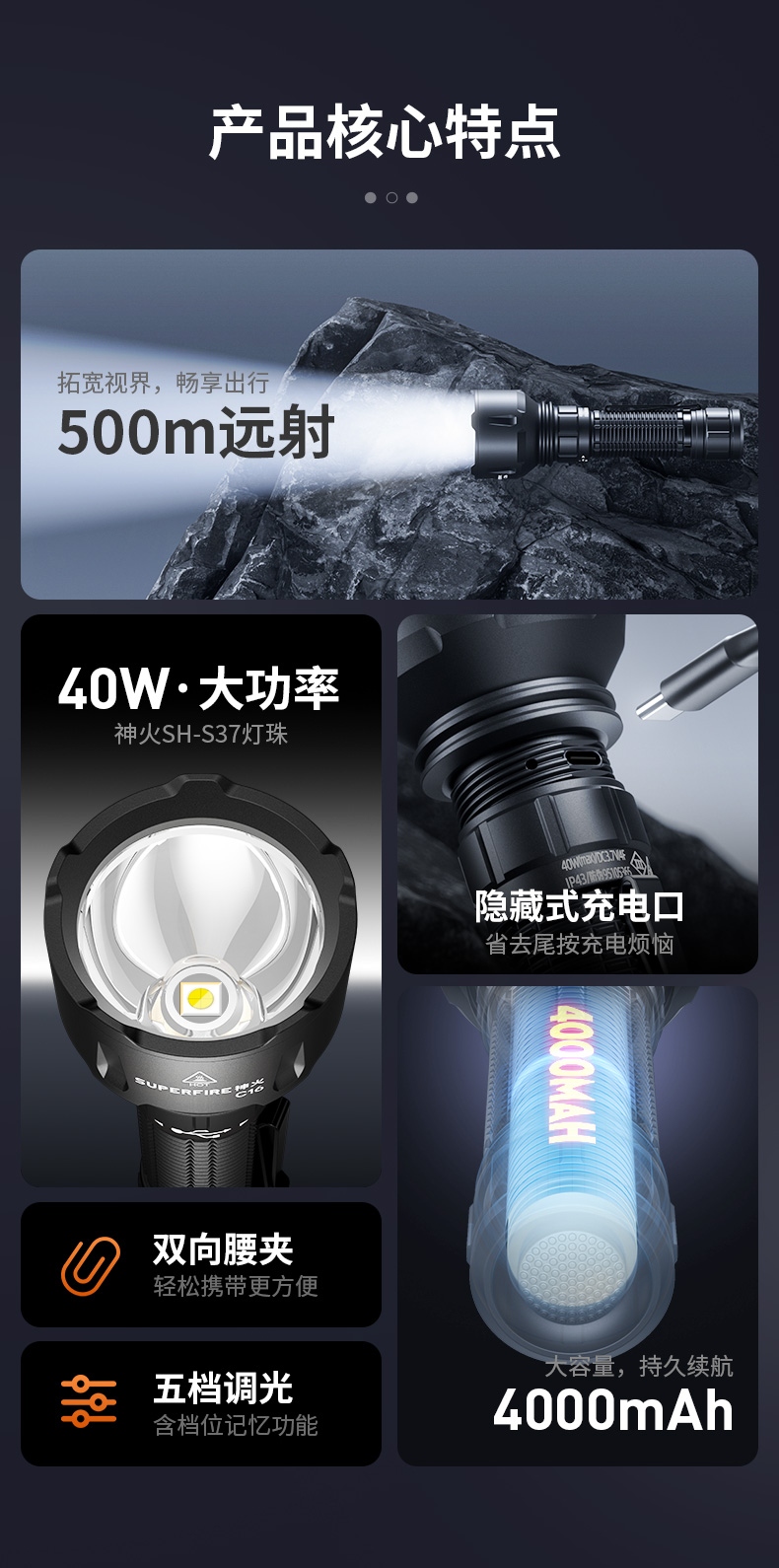 1、六檔調光,可滿足不同使用場景下的照明需求。 2、進口高亮朗明納斯燈珠,照明效果更好。 3、含檔位記憶,任意檔位快捷關機 ,開機恢復關機前檔位。