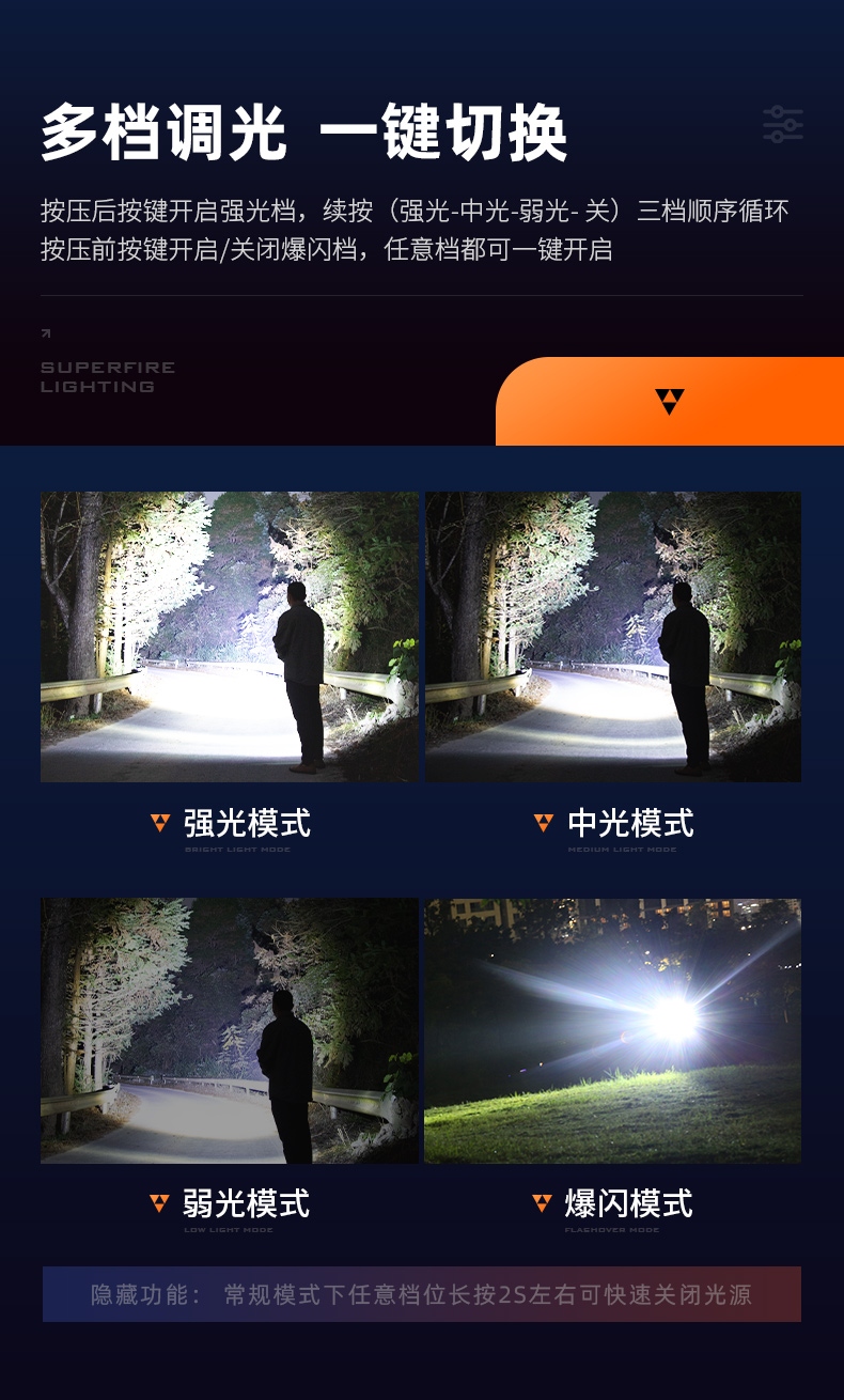1、多檔調(diào)光,可滿足不同使用場景下的照明需求。 2、多種安全程序,可有效保護(hù)手電使用安全,延長手電使用壽命。 3、精致外觀,時尚小巧。