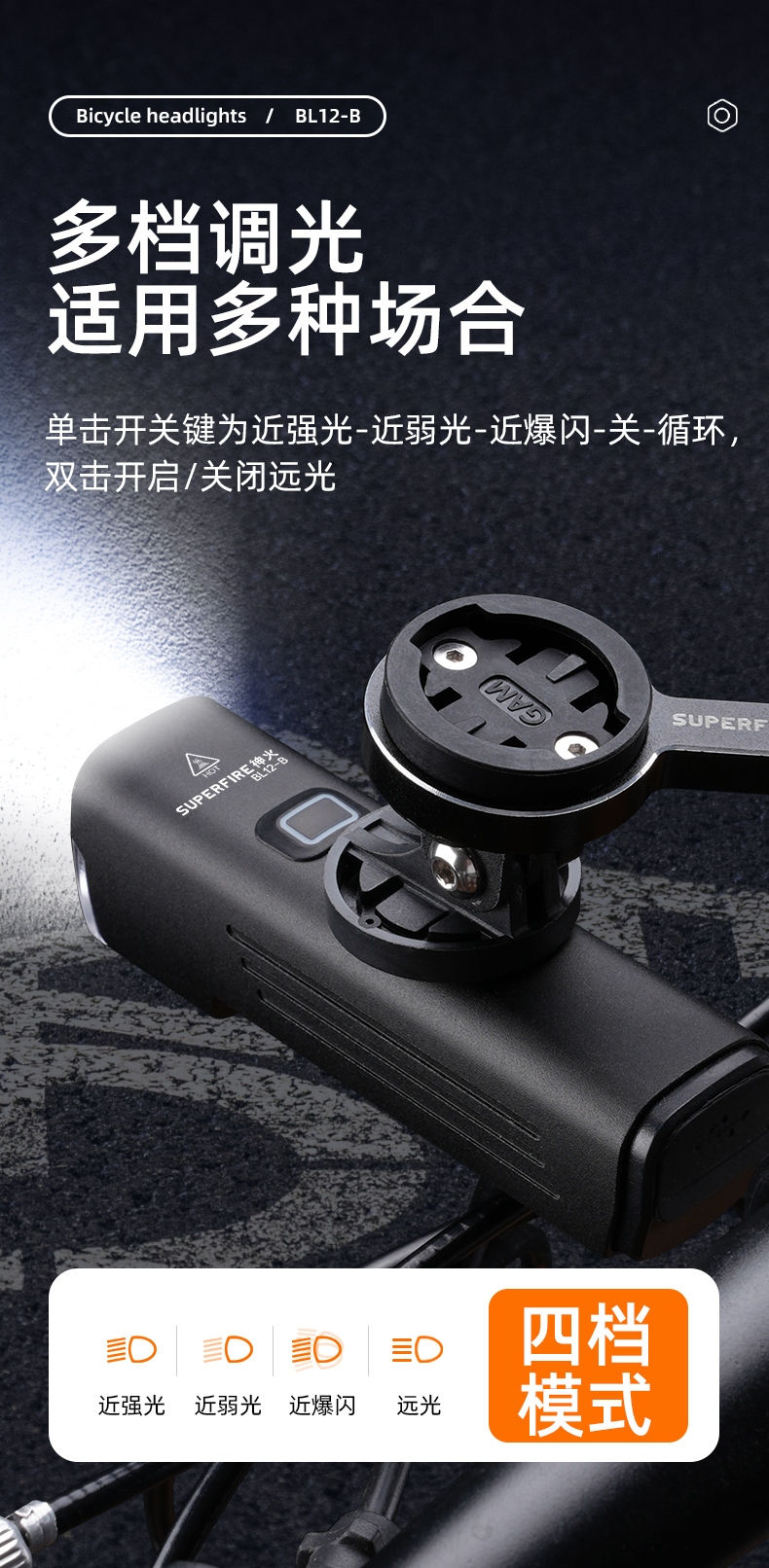 單擊開關鍵為近強光-近弱光-近爆閃-關-循環雙擊開啟/關閉遠光