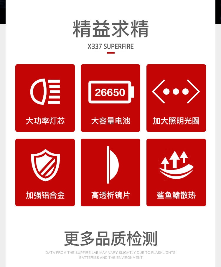1、大尺寸鋁合金光杯,光斑更圓潤。 2、新型高亮遠(yuǎn)射燈珠,40W大功率,亮度高,照明效果好。