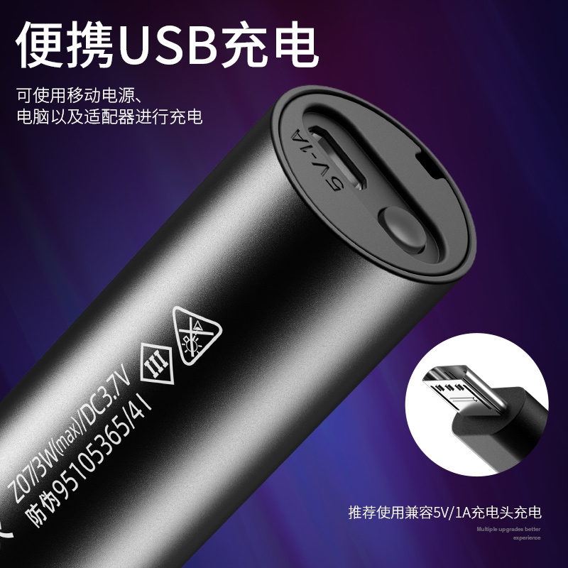 3、多樣化充電,使用方便:設有Micro-USB充電接口,可使用充電器、充電寶、電腦等設備為手電充電。