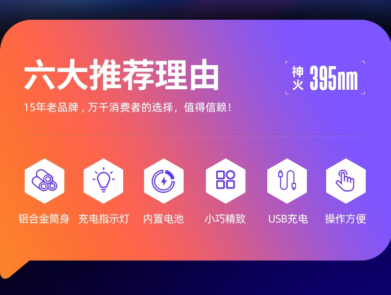 6、純凈紫光:395nm紫光,多功能,可檢測熒光、病菌、防偽。