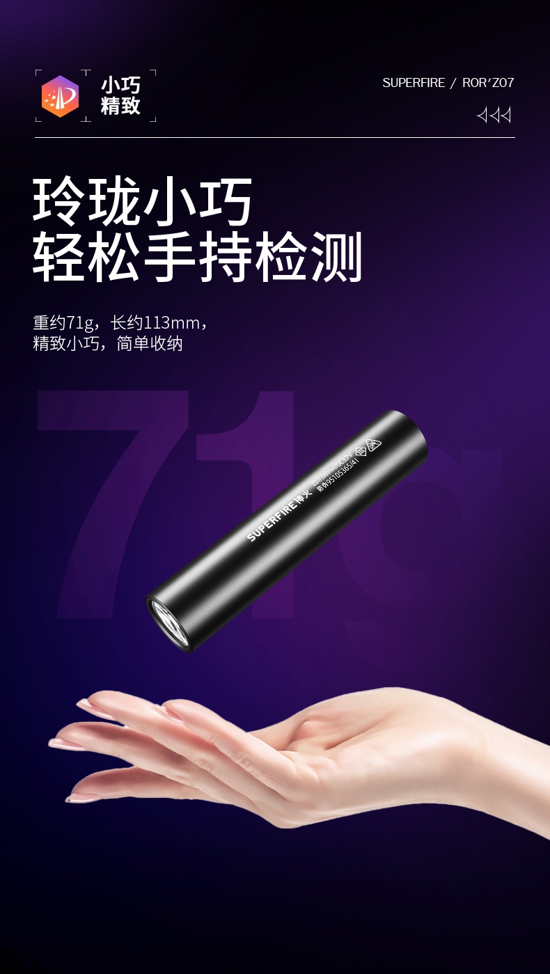 1、紫光手電:可用于驗鈔、識別熒光劑,寵物熒光檢測,鑒別琥珀、蜜蠟,古玩修補鑒定。 2、單檔開關,操作便捷。