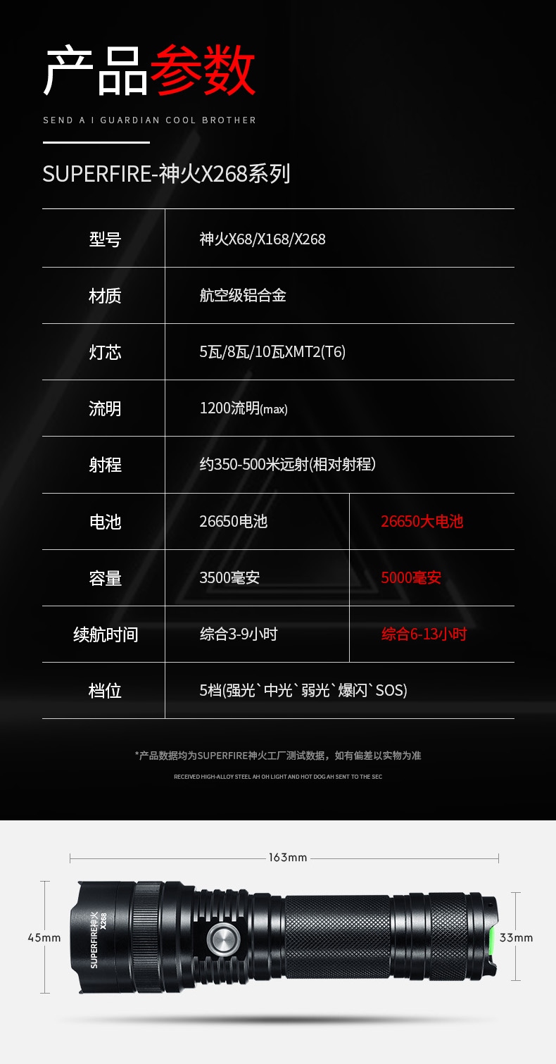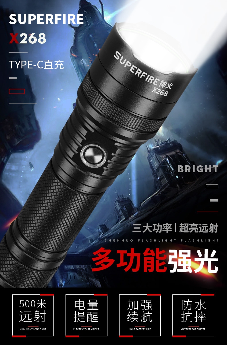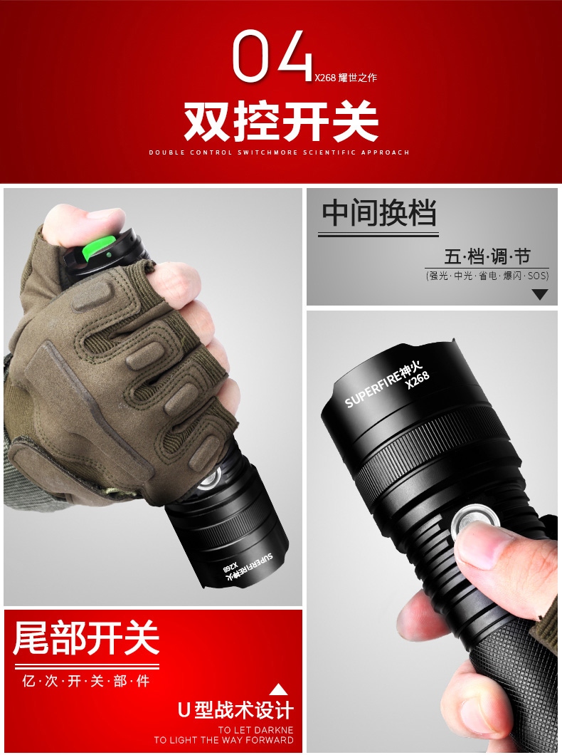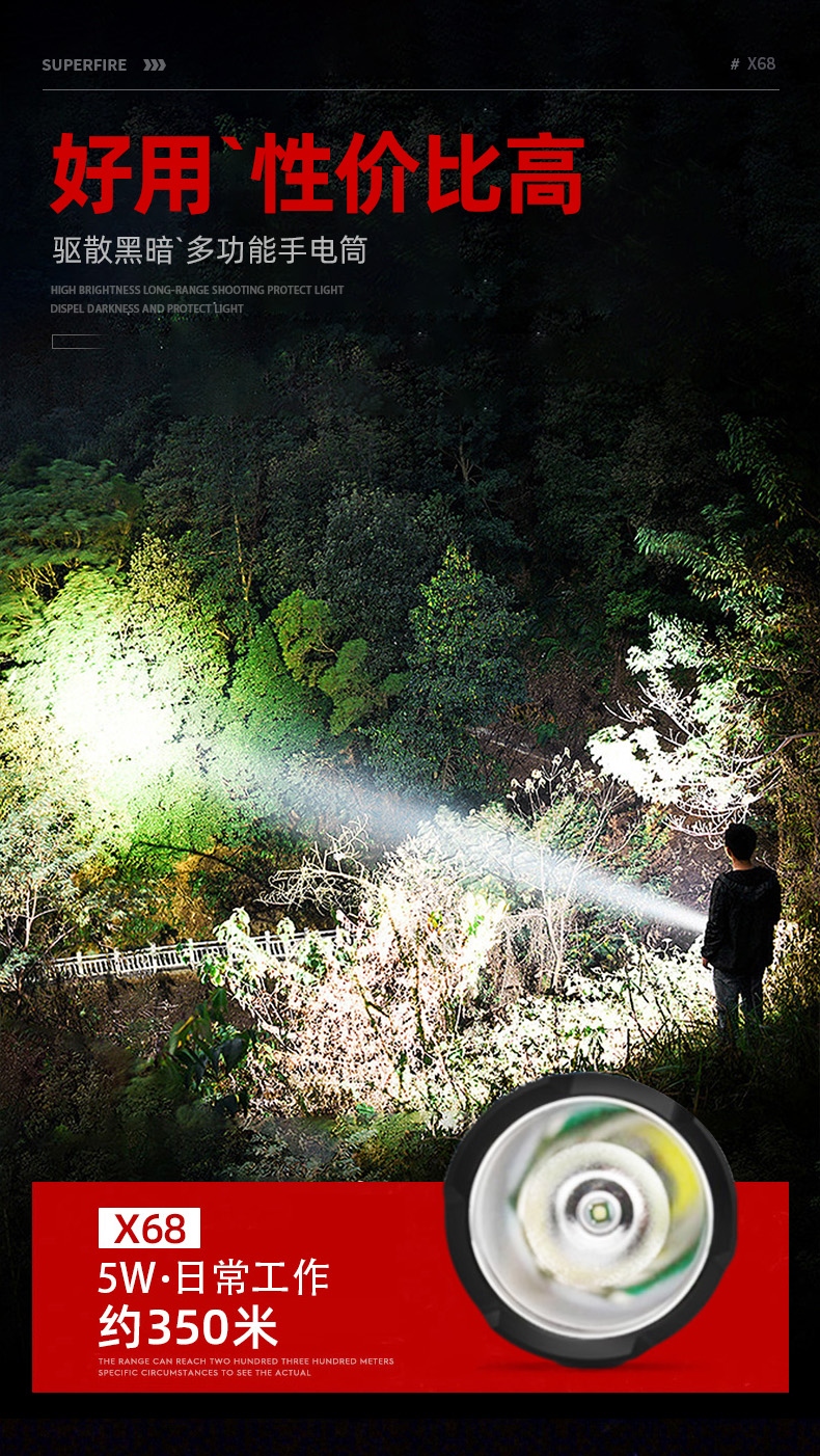 1、千米遠射,射程更遠,光斑更聚焦。 2、進口燈珠,亮度高,照明效果更好。 3、前后雙按鍵,光源一鍵點亮,高亮瞬間開啟。