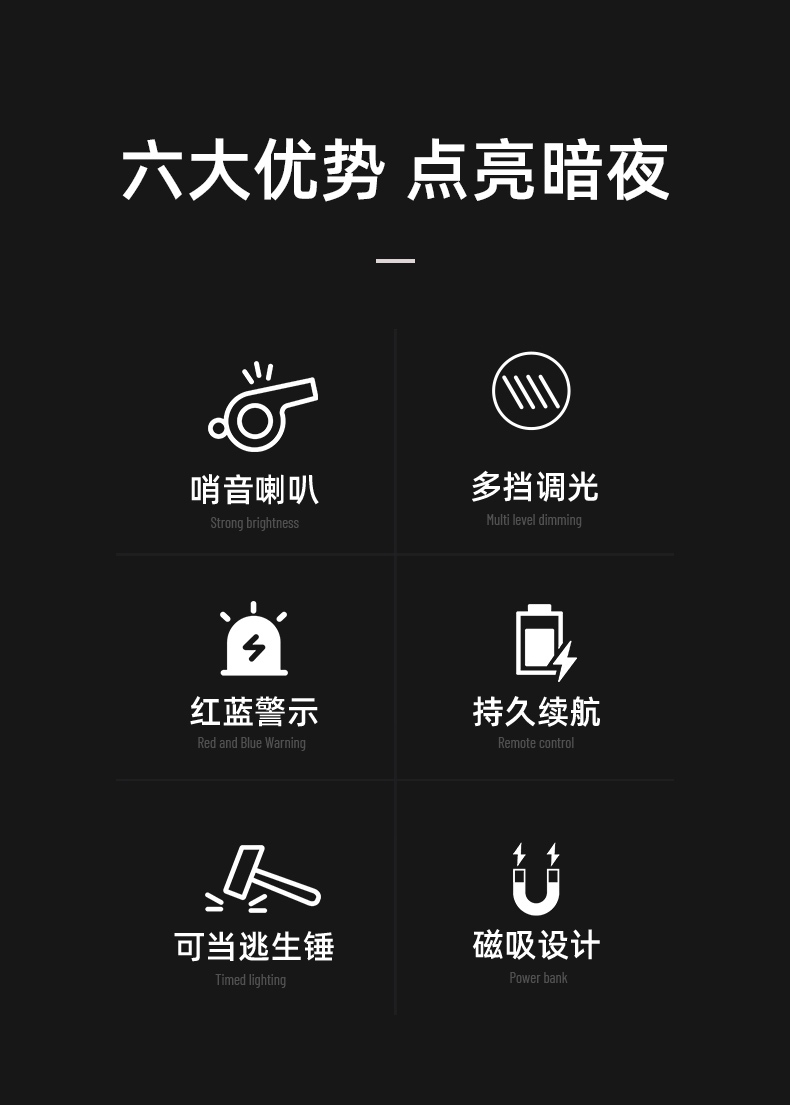 低壓保護、磁吸安裝、三檔調光、逃生錘、手電筒、蜂鳴器