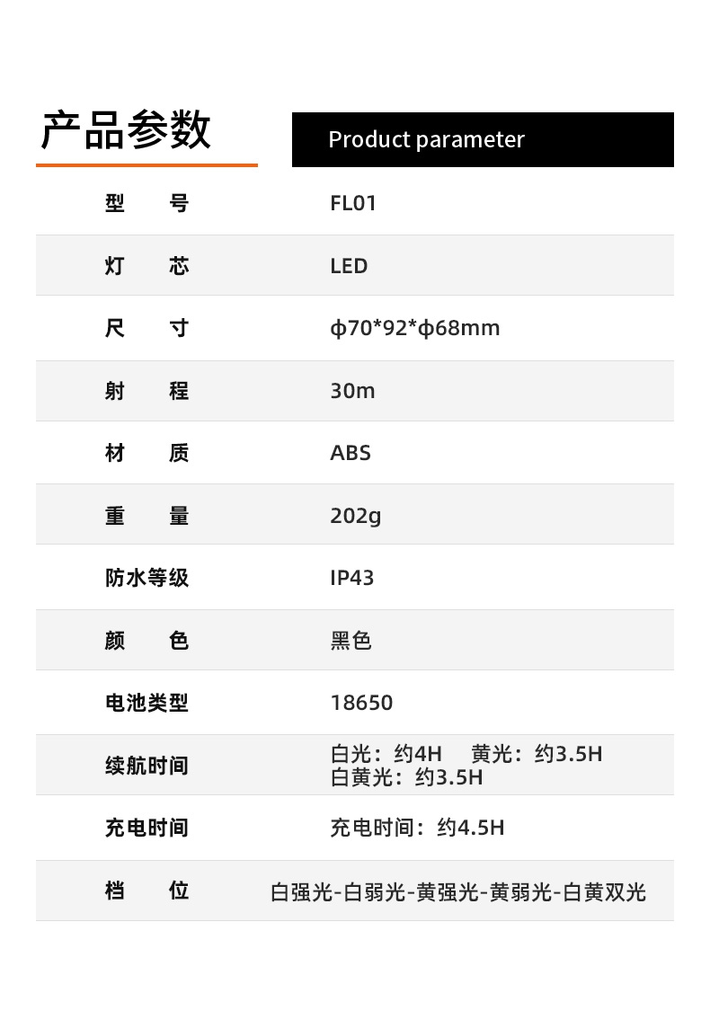 白強光:700LM、黃強光:550LM、白黃光:600LM