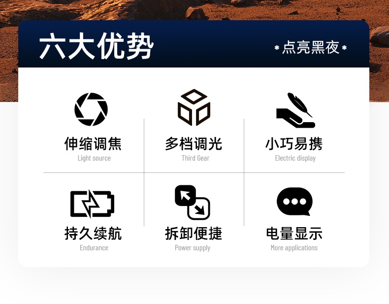 1、六檔調光,可滿足不同使用場景下的照明需求。 2、進口高亮朗明納斯燈珠,照明效果更好。 3、含檔位記憶,任意檔位快捷關機 ,開機恢復關機前檔位。