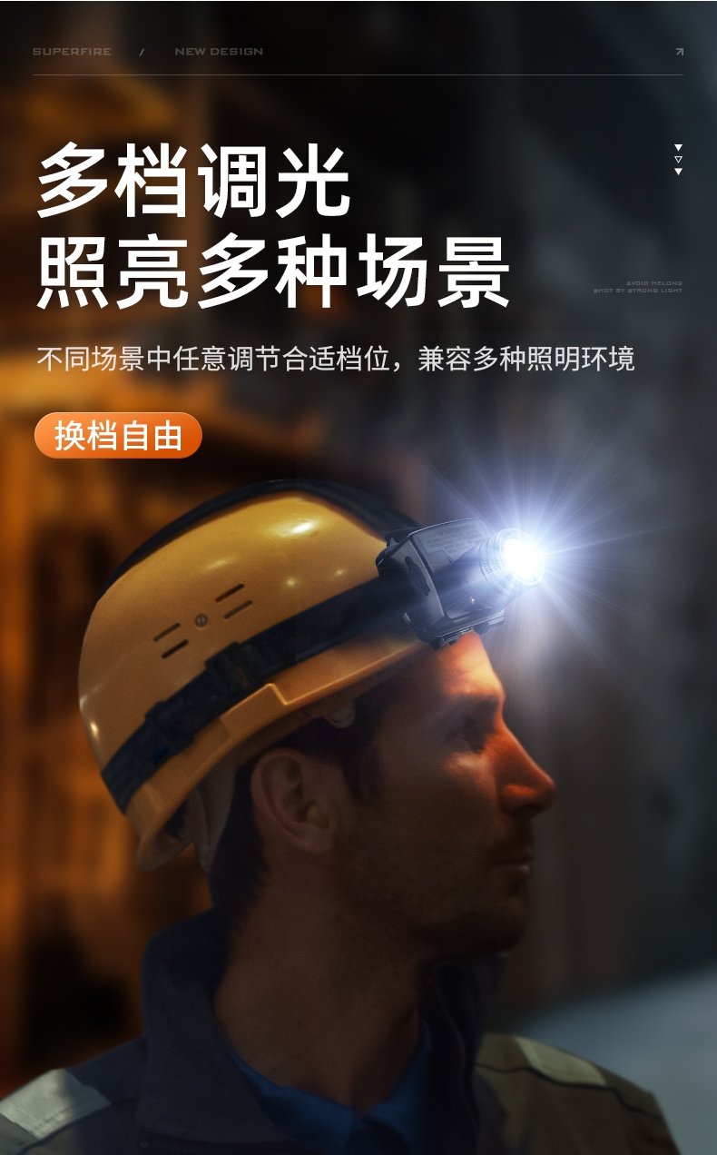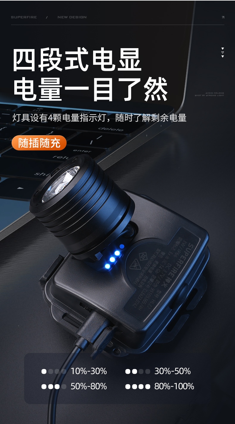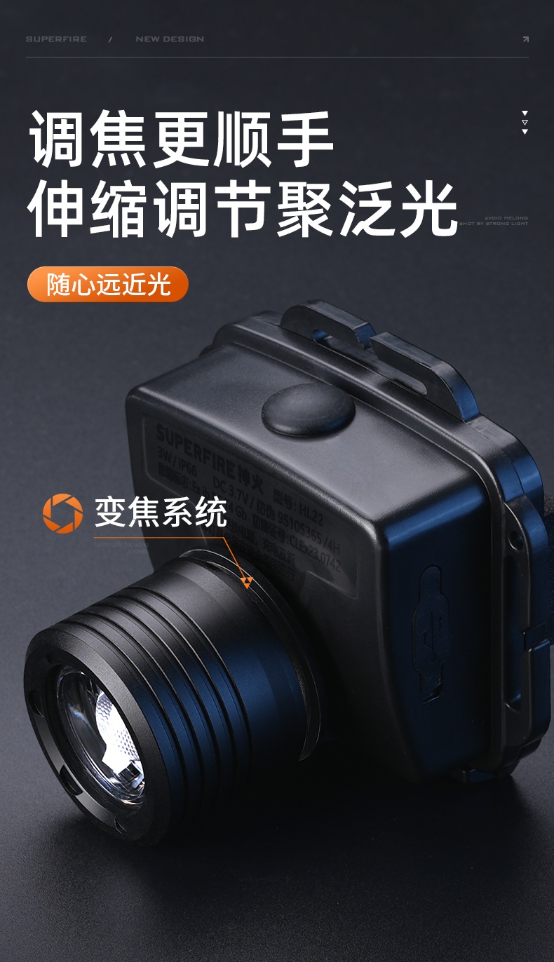 強光亮度,運動頭燈,前后均衡設計,輕便不壓頭,可調節式頭燈帶,佩戴方便舒適,伸縮調焦,光照范圍大,照射距離遠,頭燈角度調節,超90度角度隨意調節,適宜各種環境使用