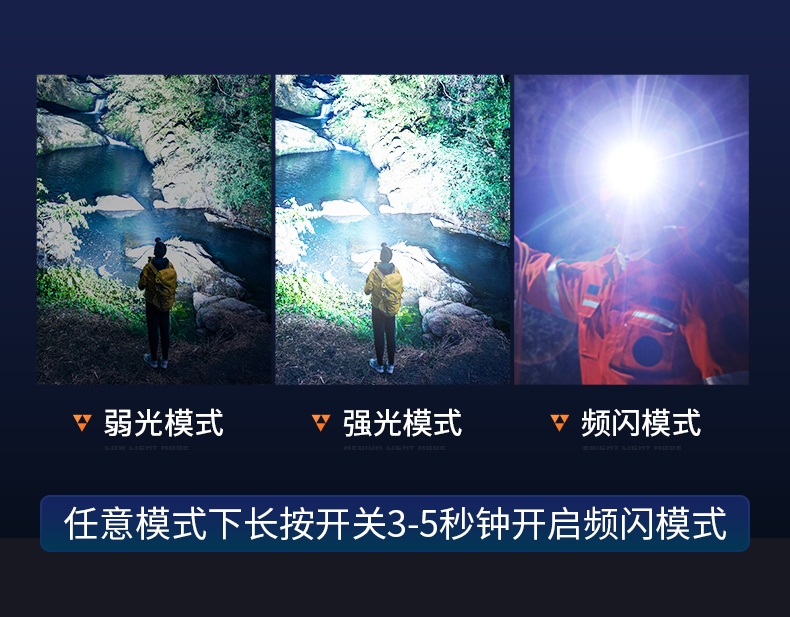 1、輕按燈頭開關按鈕,弱光點亮,再按強光點亮,再按關閉燈具,任意模式下長按開關3-5秒鐘開啟頻閃模式。
