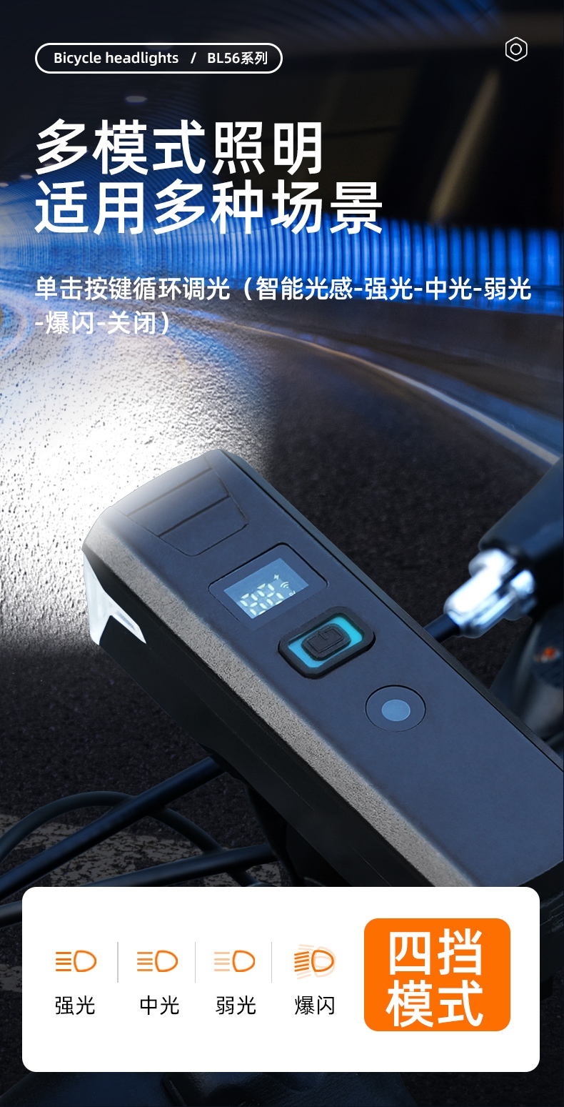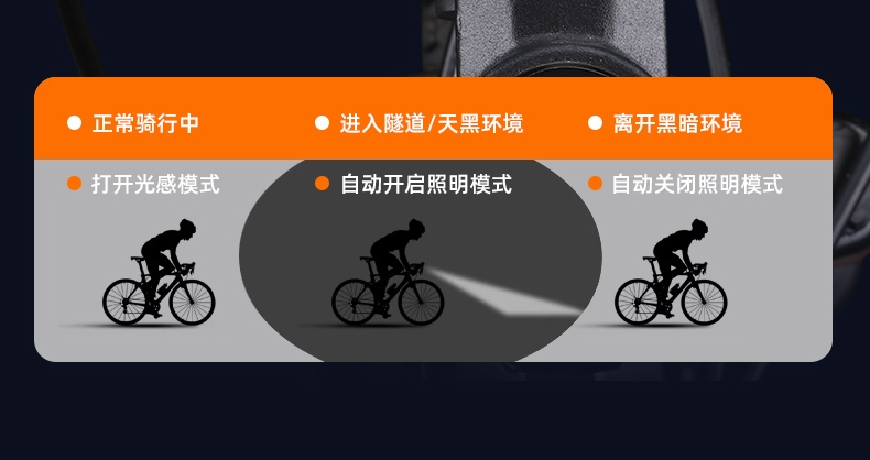 1.多模式照明適用多種場景,單擊按鍵循環調光(智能光感-強光-中光-弱光-爆閃-關閉); 2.防眩光設計,可將光線控制在一定的范圍內,有效杜絕眩光,騎行更安全; 3.工程塑料機身,從容面對惡劣環境,防腐耐磨;