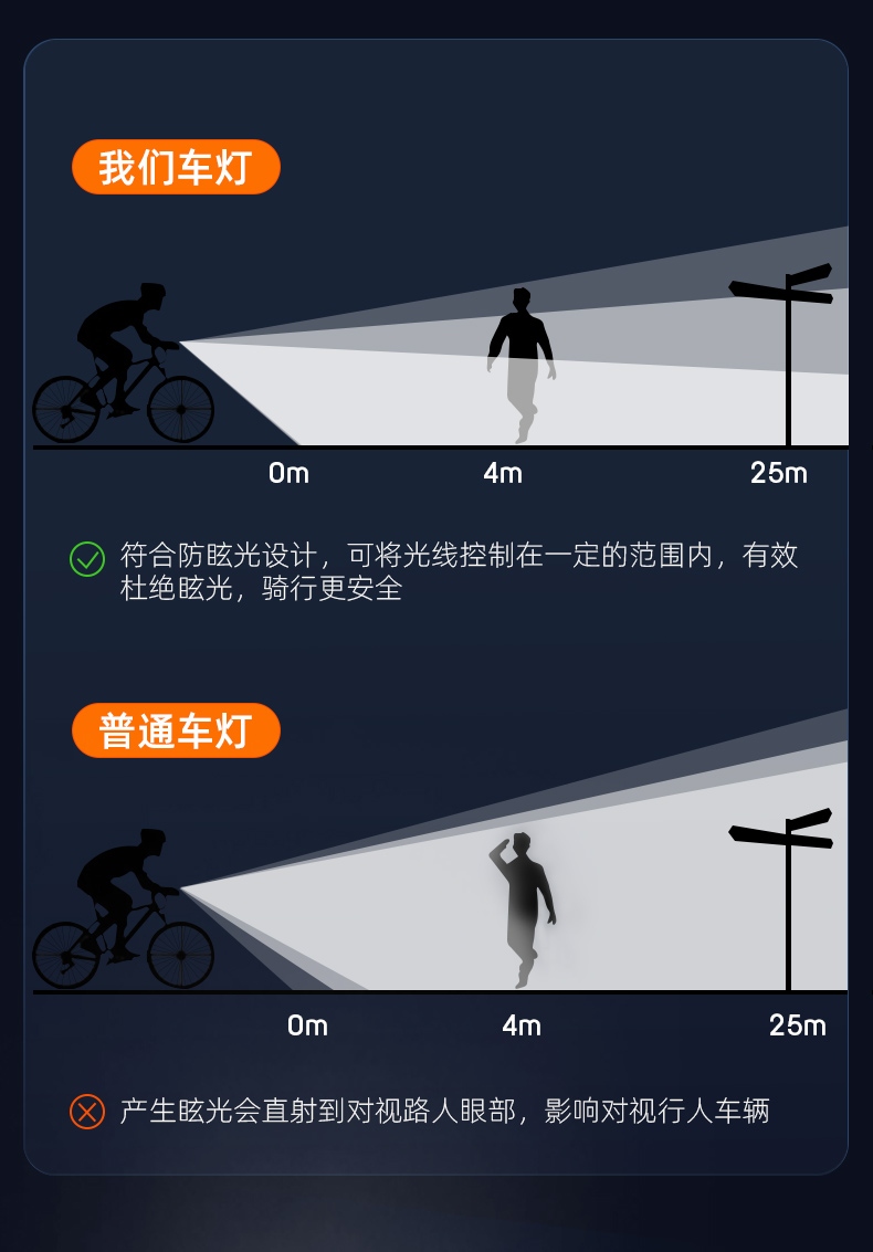2.防眩光設計,可將光線控制在一定的范圍內,有效杜絕眩光,騎行更安全;