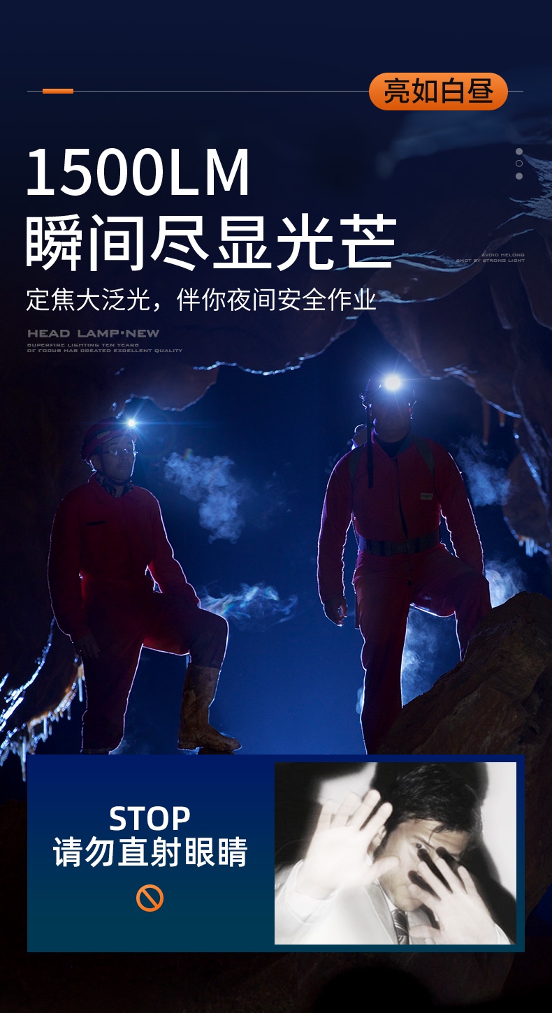 聚光主燈 亮度隨心 輕按后端開關(guān)按鈕,主燈強(qiáng)光點(diǎn)亮,續(xù)按依次切換主燈工作光-爆閃光。主燈開啟狀態(tài)下長按5秒,可實現(xiàn)光源色溫轉(zhuǎn)換。主燈關(guān)閉狀態(tài)下長按5秒,可開啟燈具最亮照明模式。 爆亮強(qiáng)光 亮如白晝 1500LM大功率高亮光源,點(diǎn)亮頃刻如白晝