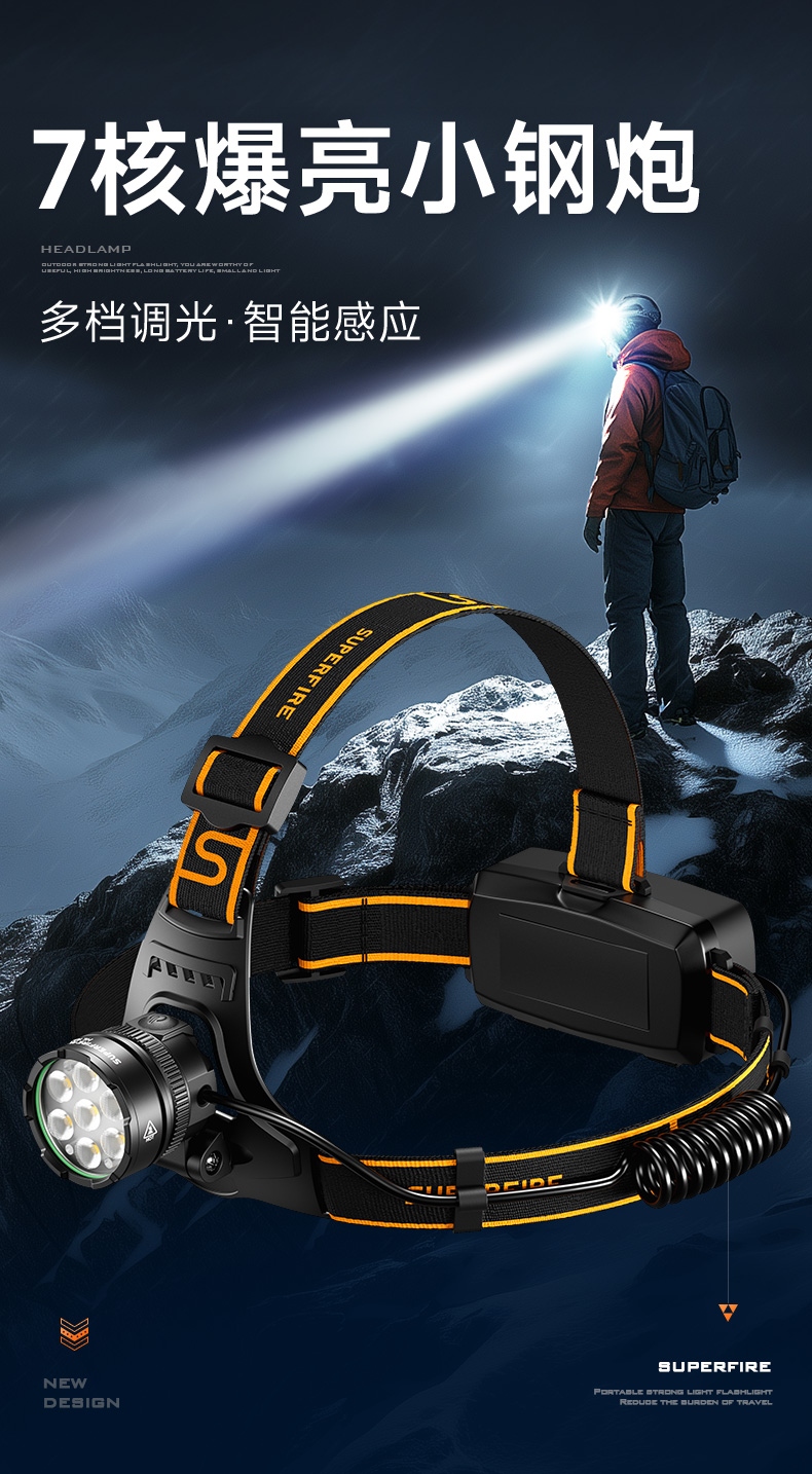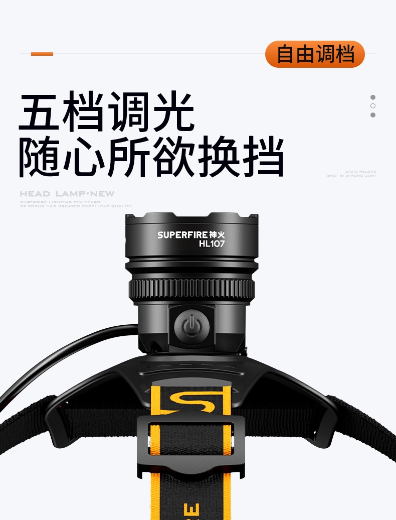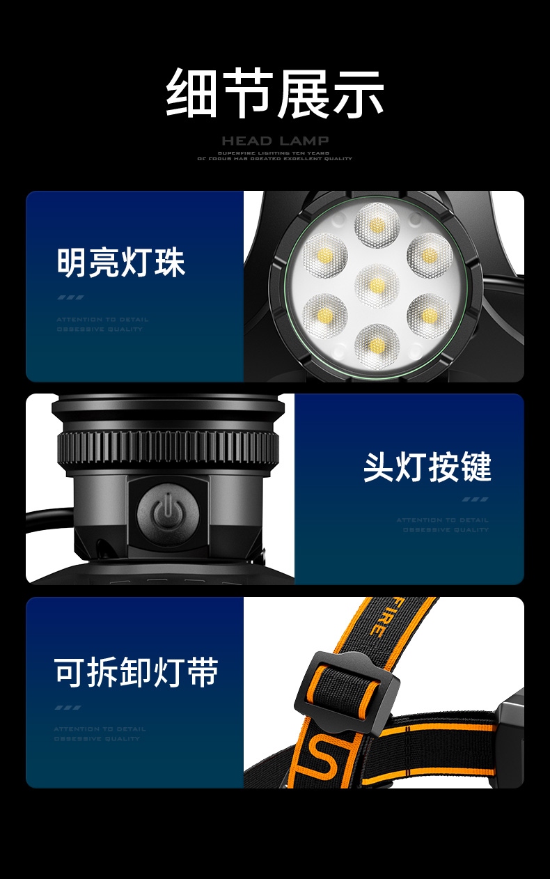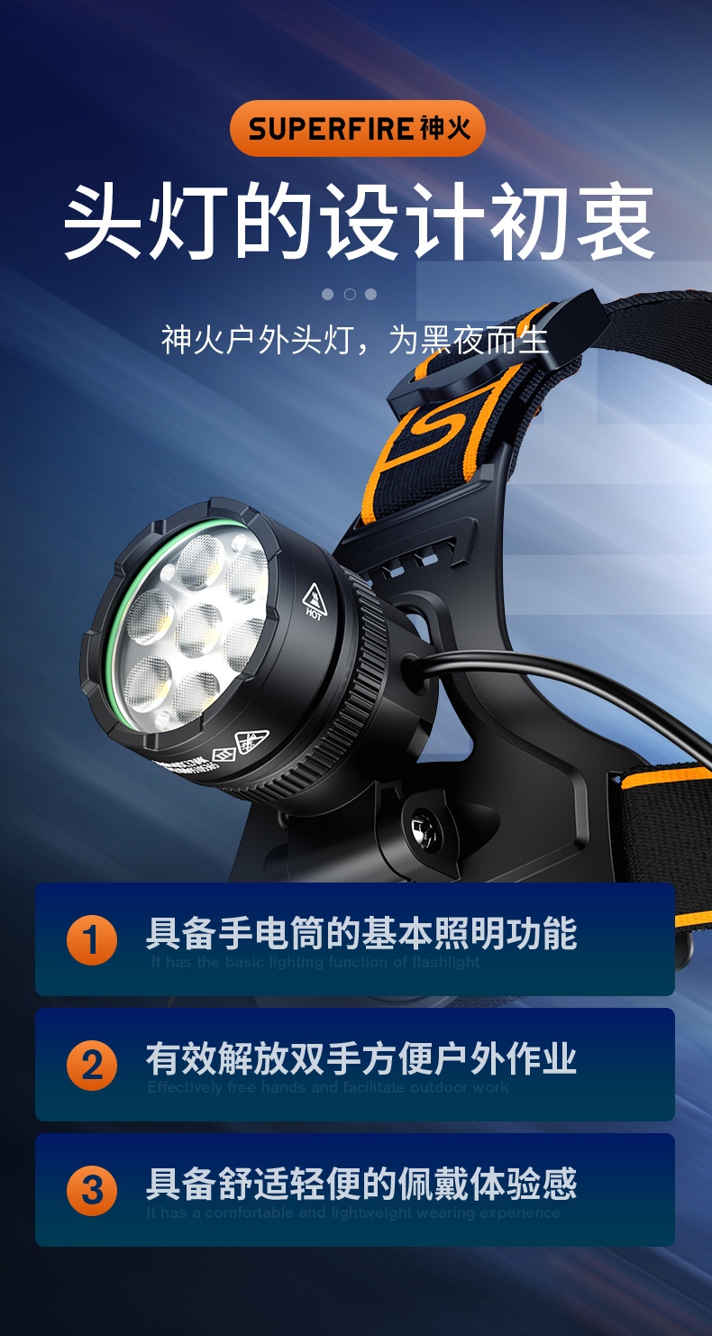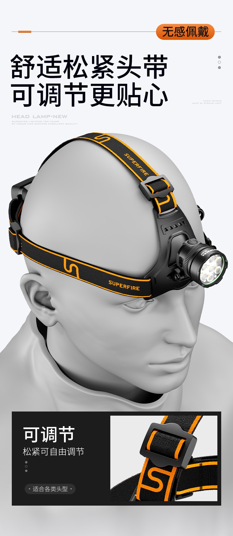 強(qiáng)光亮度,運(yùn)動頭燈,前后均衡設(shè)計,輕便不壓頭,可調(diào)節(jié)式頭燈帶,佩戴方便舒適,伸縮調(diào)焦,光照范圍大,照射距離遠(yuǎn),頭燈角度調(diào)節(jié),超90度角度隨意調(diào)節(jié),適宜各種環(huán)境使用