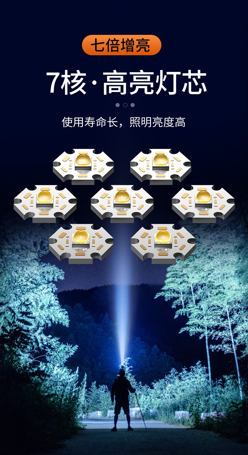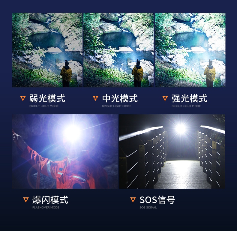 1、五檔一體:弱中強(qiáng)、爆閃、SOS自由切換,可滿足不同場景下的使用需求;