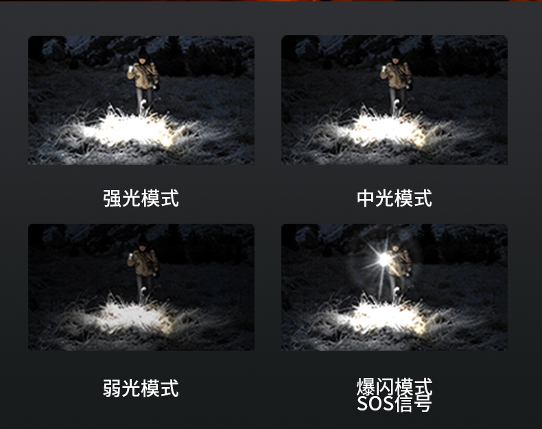 聚光主燈 亮度隨心 輕按后端開關(guān)按鈕,主燈強(qiáng)光點(diǎn)亮,續(xù)按依次切換主燈工作光-爆閃光。主燈開啟狀態(tài)下長按5秒,可實(shí)現(xiàn)光源色溫轉(zhuǎn)換。主燈關(guān)閉狀態(tài)下長按5秒,可開啟燈具最亮照明模式。 爆亮強(qiáng)光 亮如白晝 1500LM大功率高亮光源,點(diǎn)亮頃刻如白晝