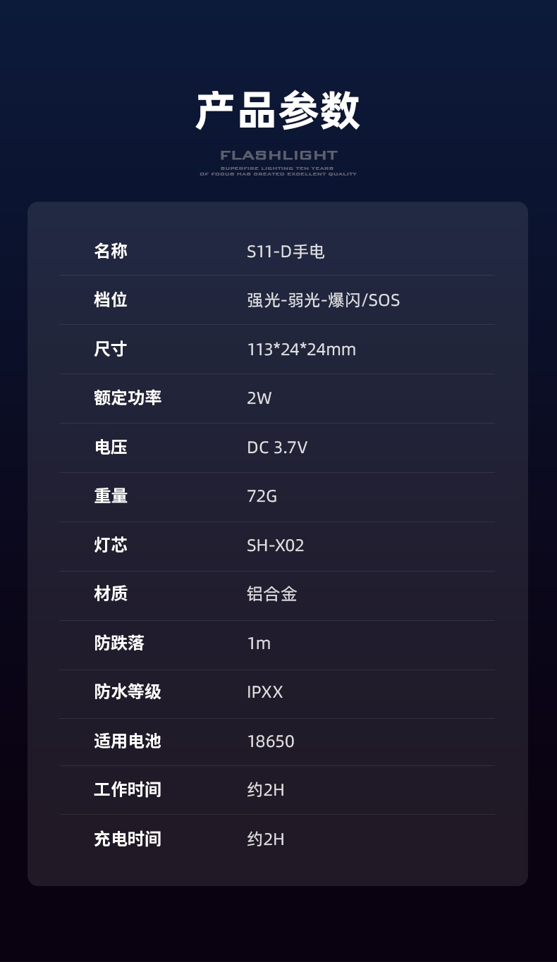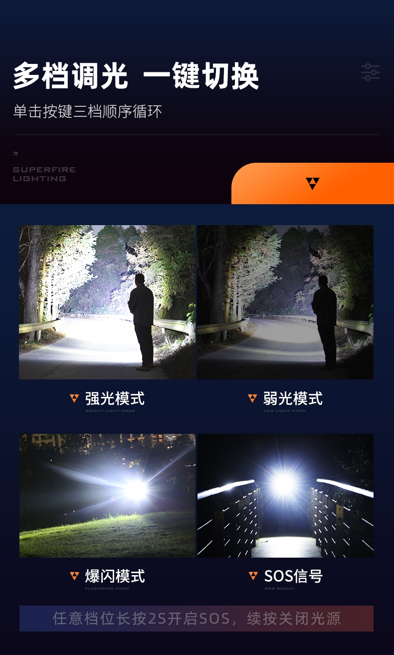 1、按壓尾部開關即開啟強光檔,續按調檔(強光-弱光-爆閃-關),任何檔位長按3s即開啟 SOS檔位,續按關閉光源。