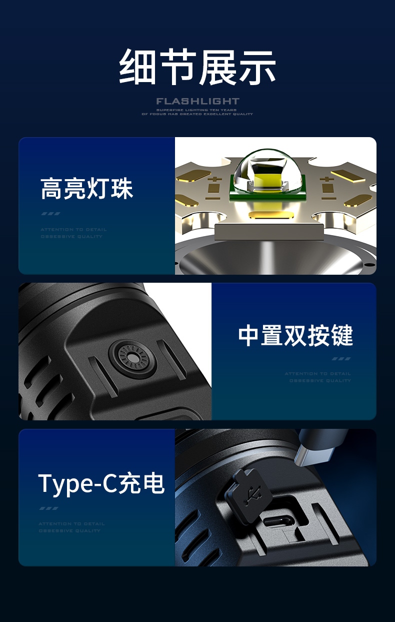 1、大功率燈芯:輸出強力最高可達2900LM,照射范圍廣,420m直光遠射;