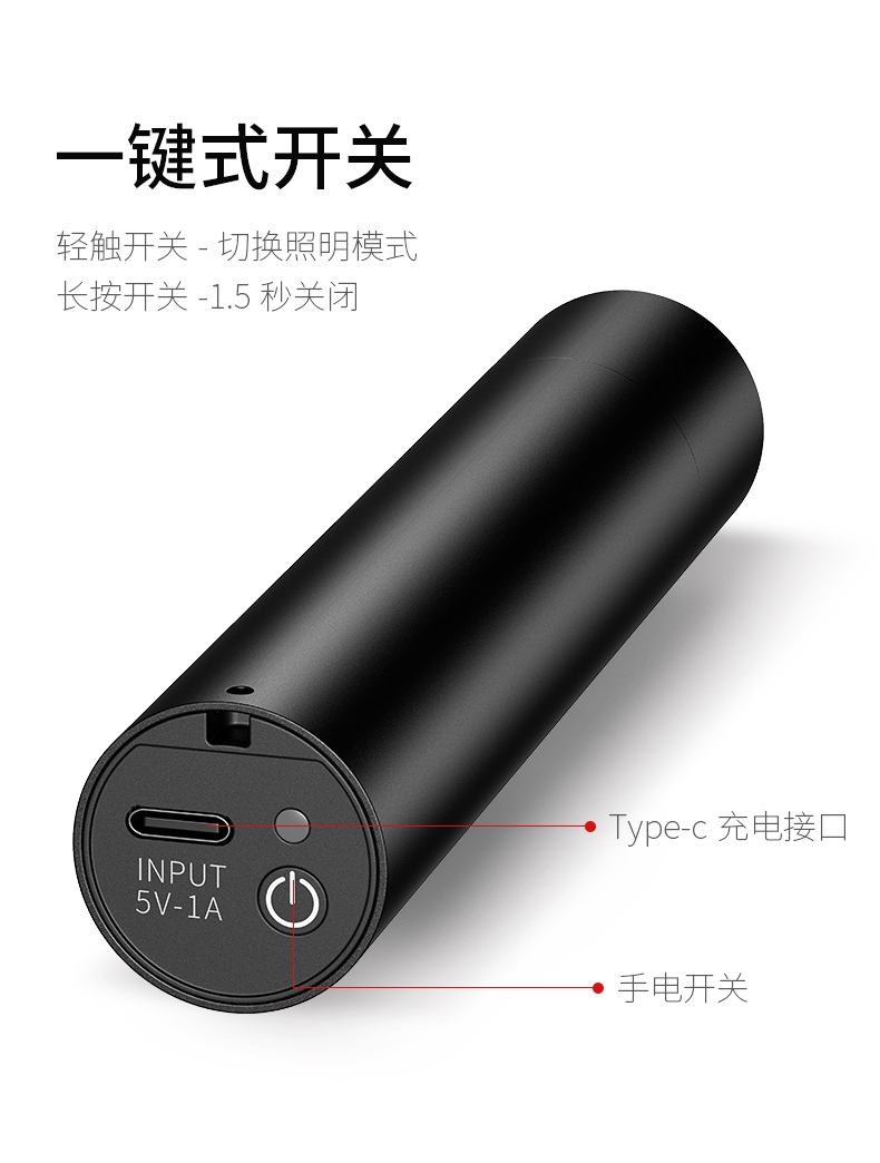 1.單擊左邊開關開啟感應功能,同時開啟強光檔,續按關閉感應功能(關閉感應功能,光源不會關閉),當感應功能開啟時,單擊右邊開關可正常調節檔位。 2.多樣化充電,使用方便:設有Type-c充電口,可使用充電器、充電寶、電腦等設備為燈具充電。 3.電量顯示:實時