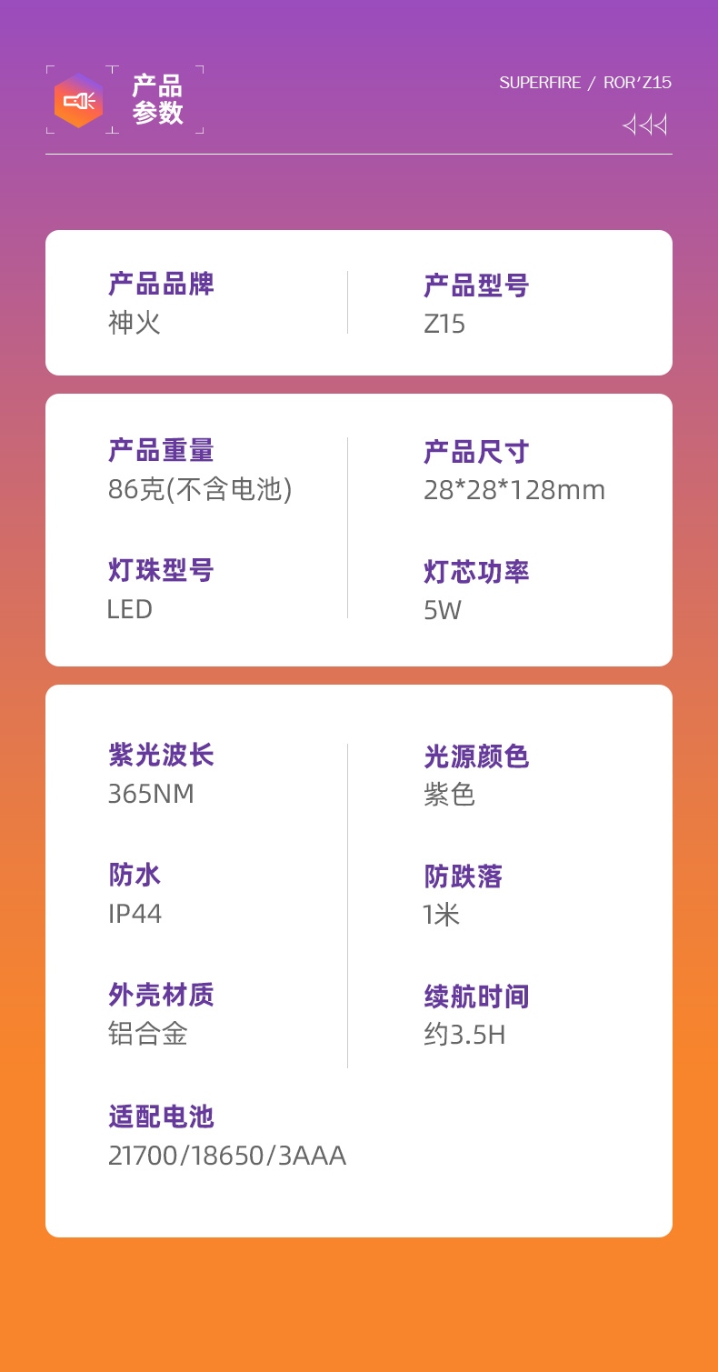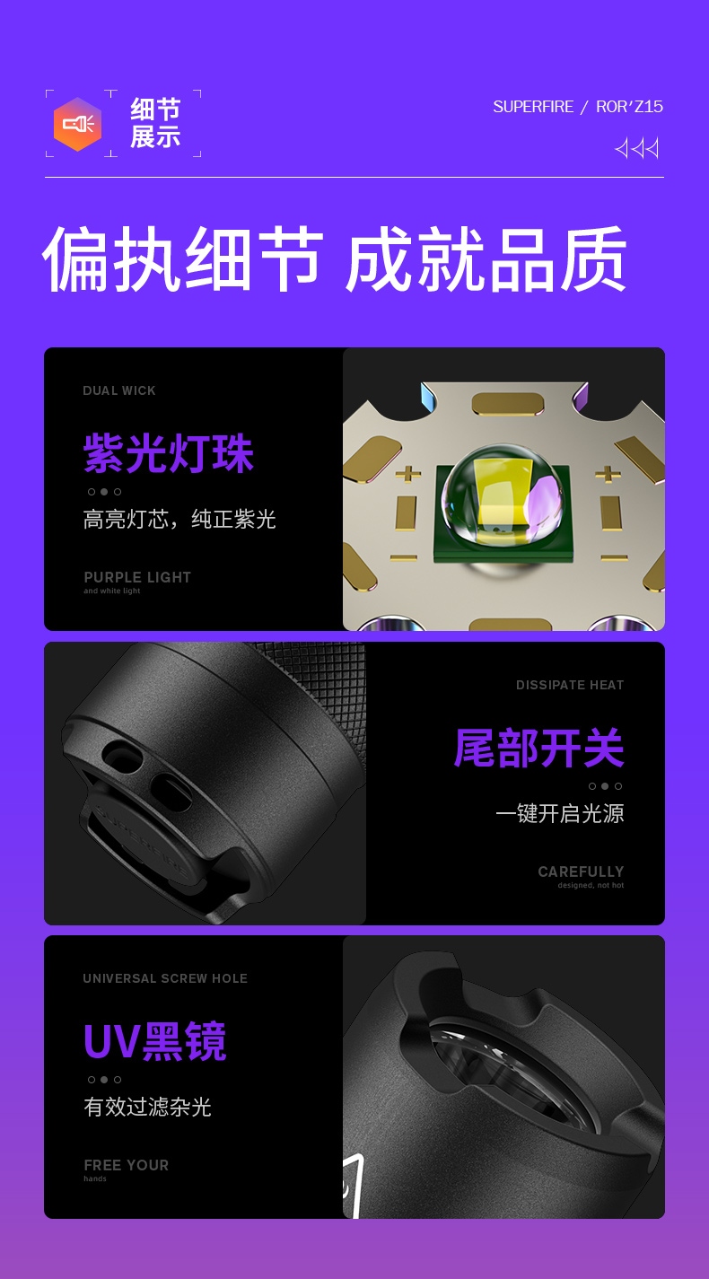 1、紫光手電,配有黑鏡:可用于驗鈔、識別熒光劑,寵物病菌檢測,鑒別琥珀、蜜蠟,古玩修補鑒定。 2、單檔開關,操作便捷。 3、小巧精致,外出攜帶更方便。