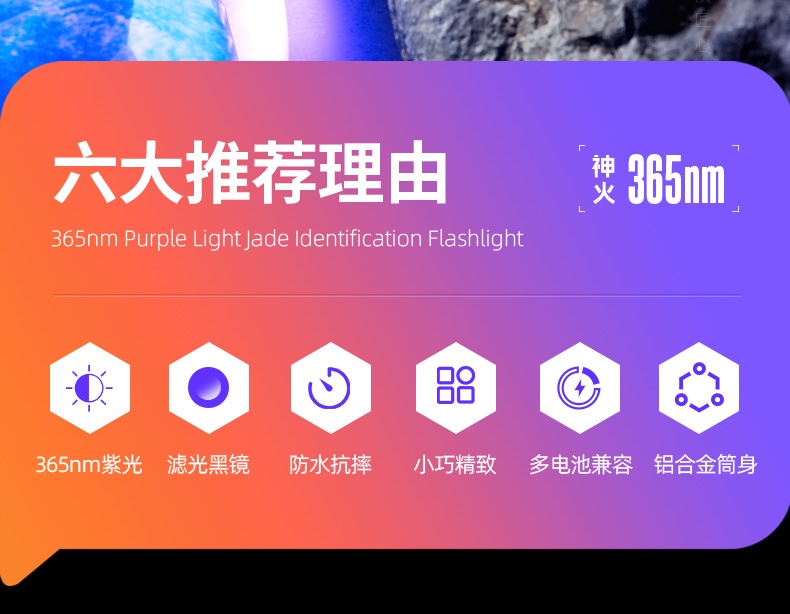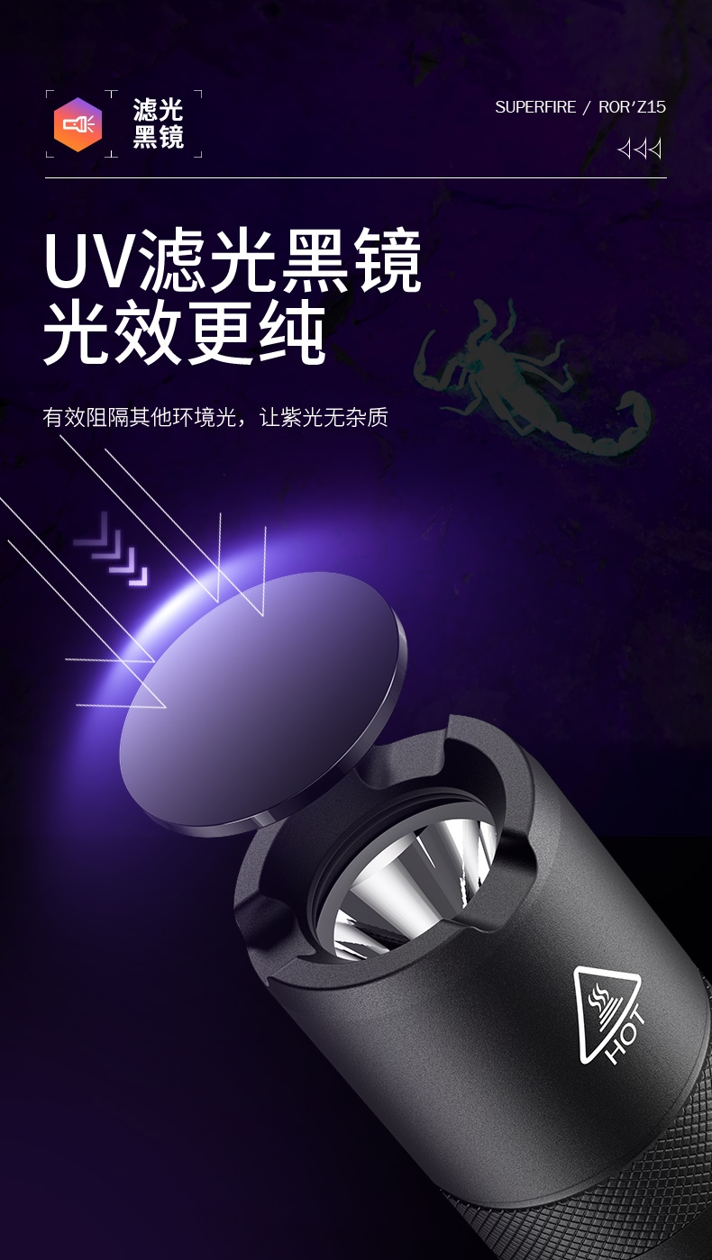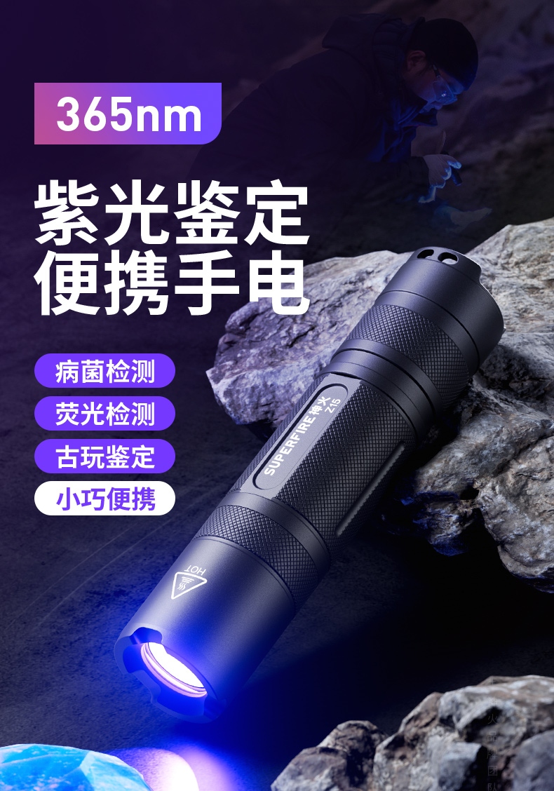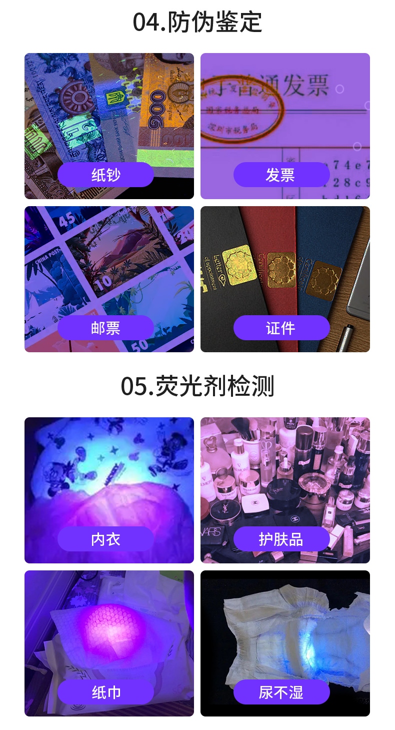 1、紫光手電,配有黑鏡:可用于驗鈔、識別熒光劑,寵物病菌檢測,鑒別琥珀、蜜蠟,古玩修補鑒定。
