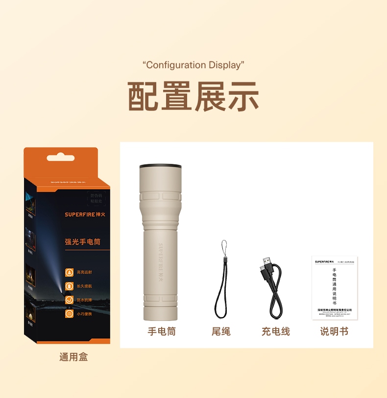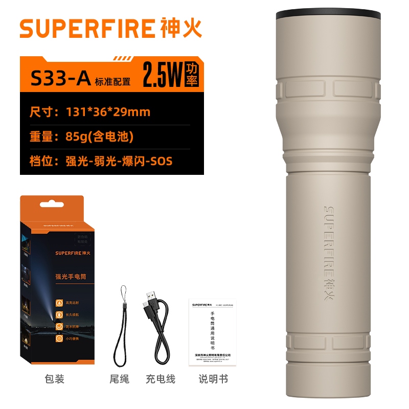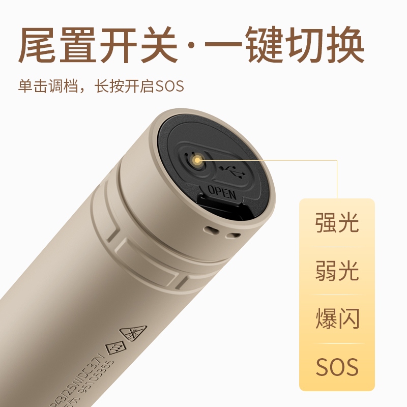 1、按壓尾置開(kāi)關(guān)按鍵即開(kāi)啟強(qiáng)光檔,續(xù)按調(diào)檔(強(qiáng)光-弱光-爆閃-關(guān))可循環(huán)換擋。任何擋位長(zhǎng)按3秒左右開(kāi)啟 SOS擋位,續(xù)按關(guān)閉. 2、小巧便攜,重量輕,攜帶更方便。 3、小USB充電接口,充電更方便。