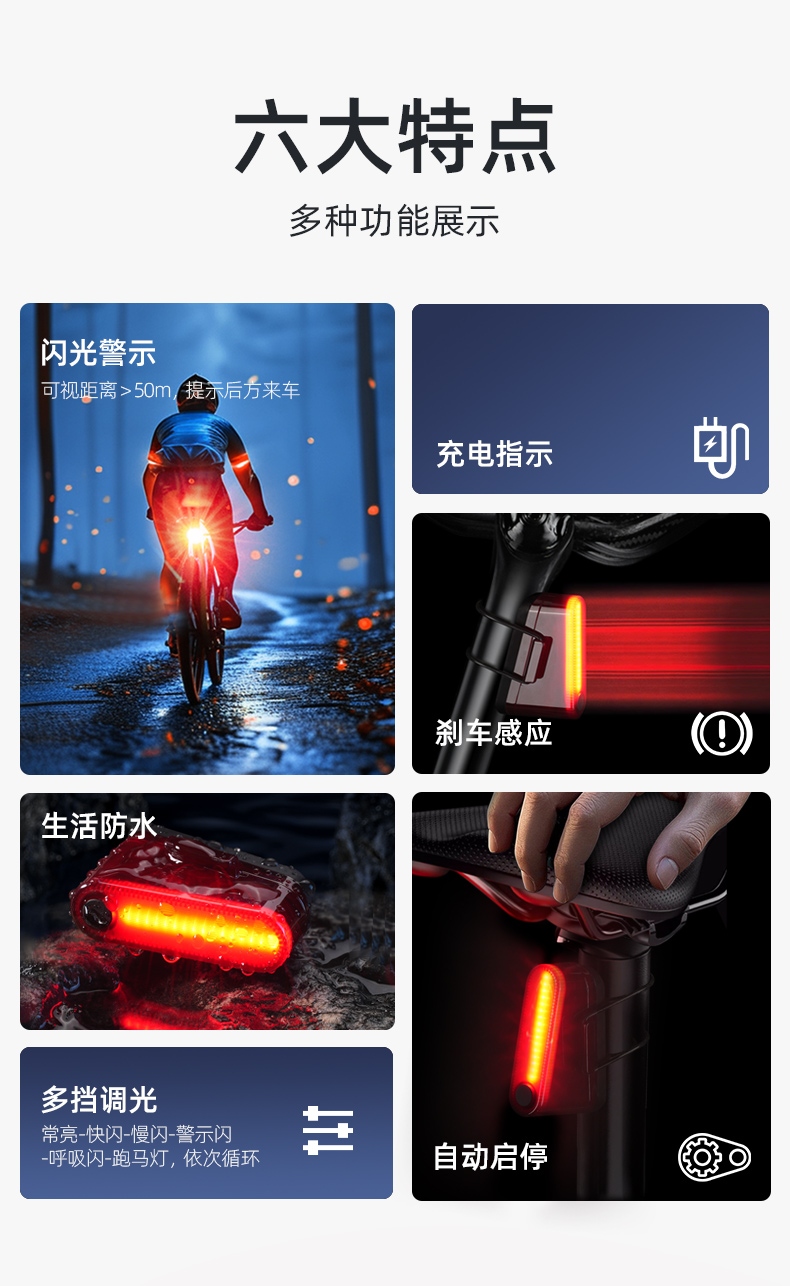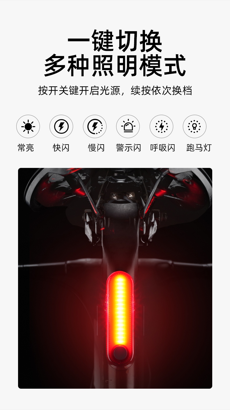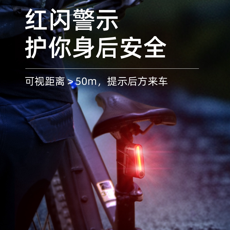 1、紅閃警示,護你身后安全,可視距離>50m,提示后方來車; 2、多種照明模式,一鍵切換,按開關鍵開啟光源,續按依次換檔; 3、智能感應警示,剎車更顯眼,車燈感應到剎車時會以最大亮度顯示;