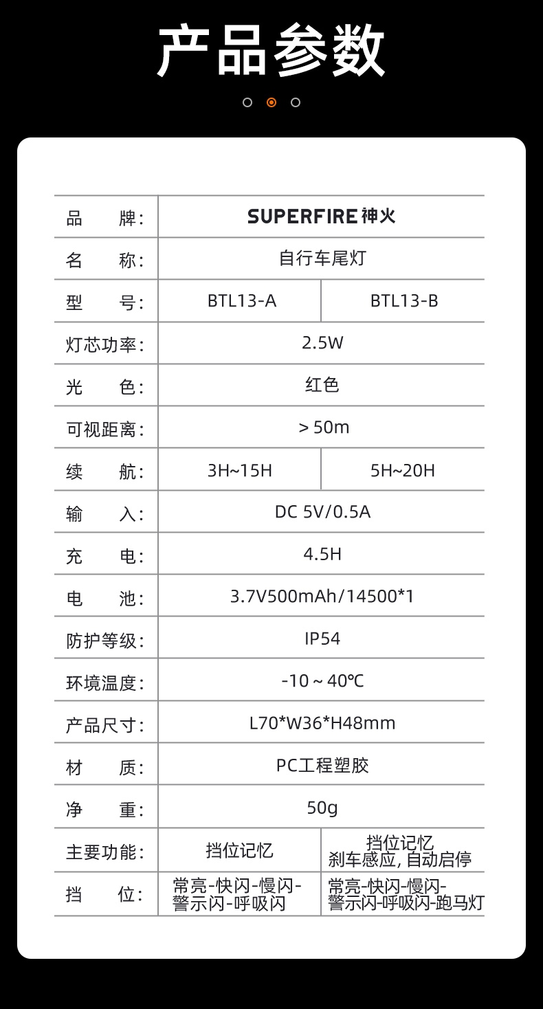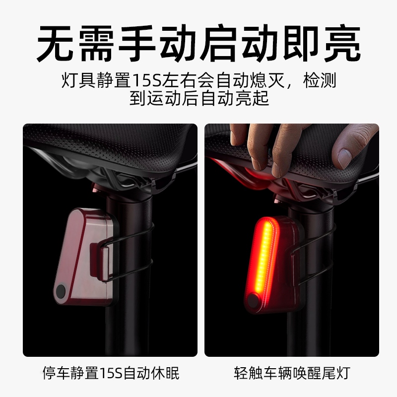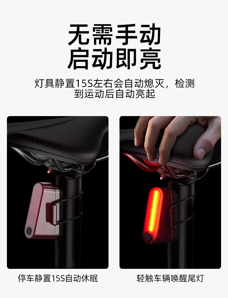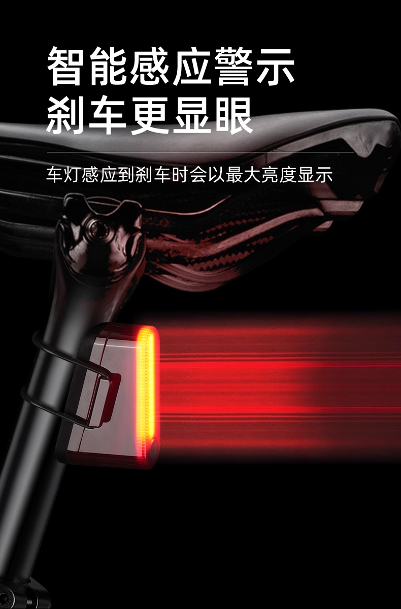 1、紅閃警示,護你身后安全,可視距離>50m,提示后方來車; 2、多種照明模式,一鍵切換,按開關鍵開啟光源,續按依次換檔; 3、智能感應警示,剎車更顯眼,車燈感應到剎車時會以最大亮度顯示;