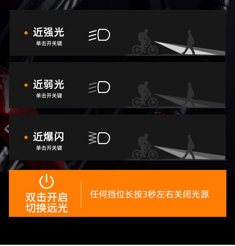 2、多檔位可調光,一鍵操作切換,單擊開關鍵為近強光-近弱光-近爆閃,雙擊開啟/切換遠光;