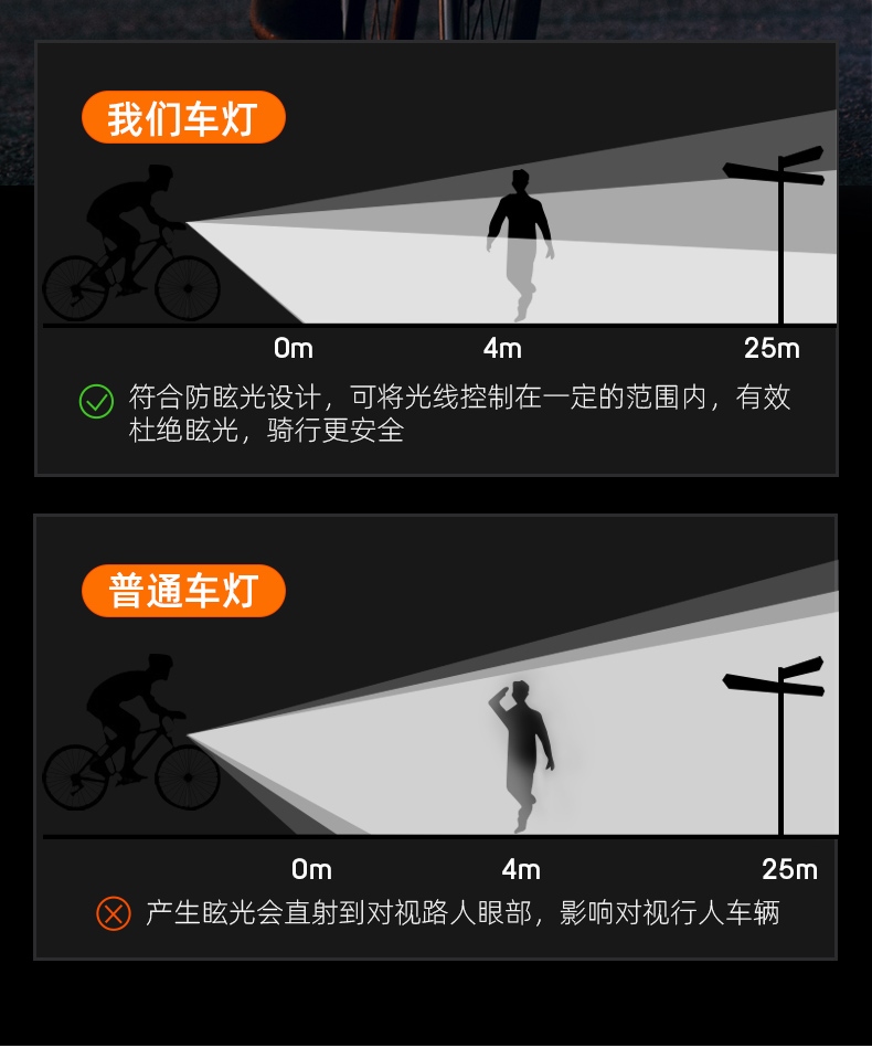 3、遠/近組合燈珠,科學矩陣防眩光,遠近光科學切換,路況一眼便知,安全夜騎更貼心;