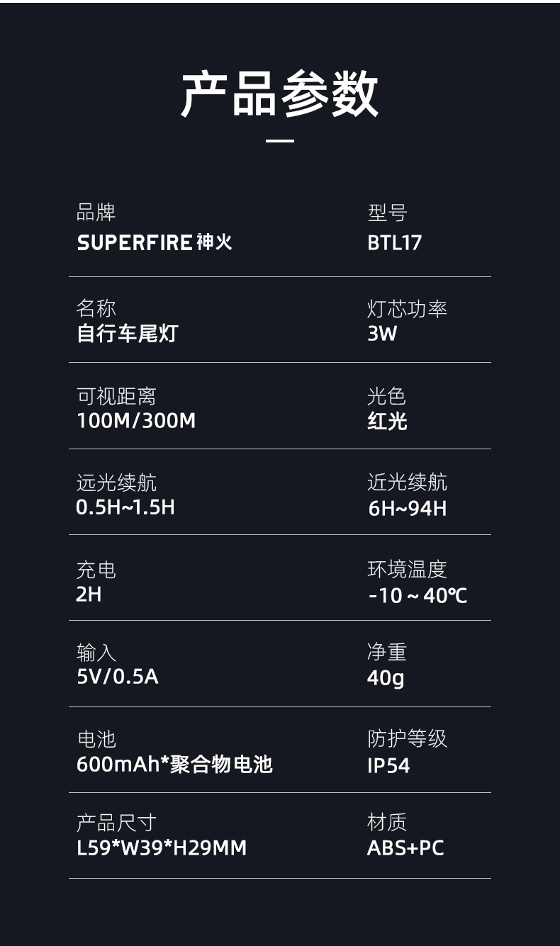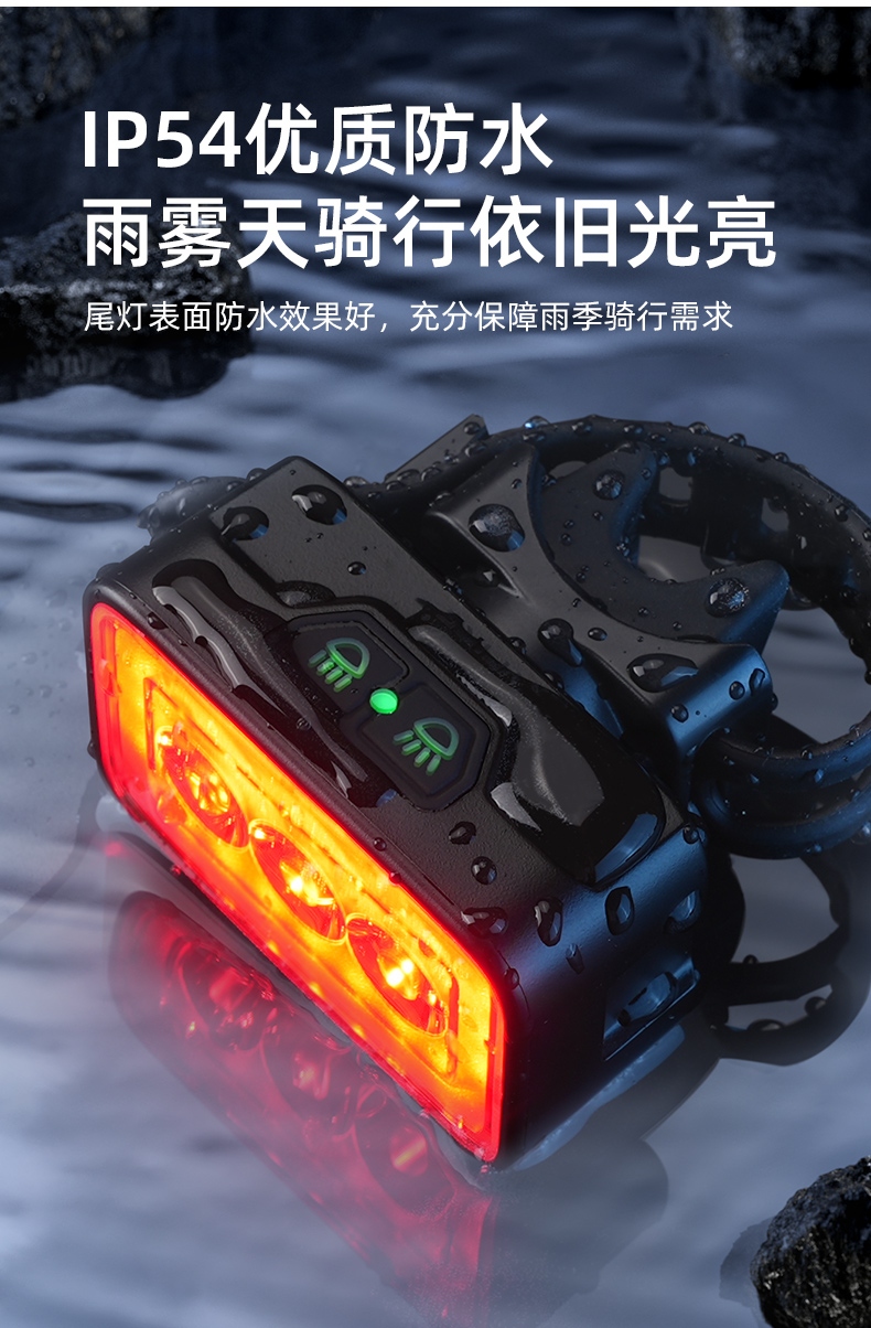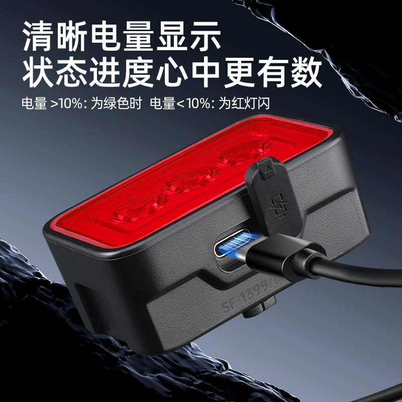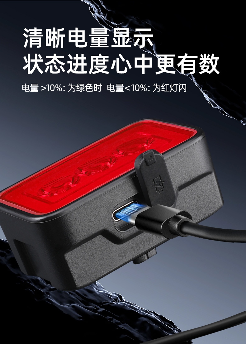 1、尾燈自帶擋位記憶功能,開燈后5秒內單擊切換擋位,5秒后單擊關閉尾燈。 2、電量指示燈:為綠色時電量>10%,為紅燈閃<10%,充電時紅燈呼吸閃,充滿滅燈。