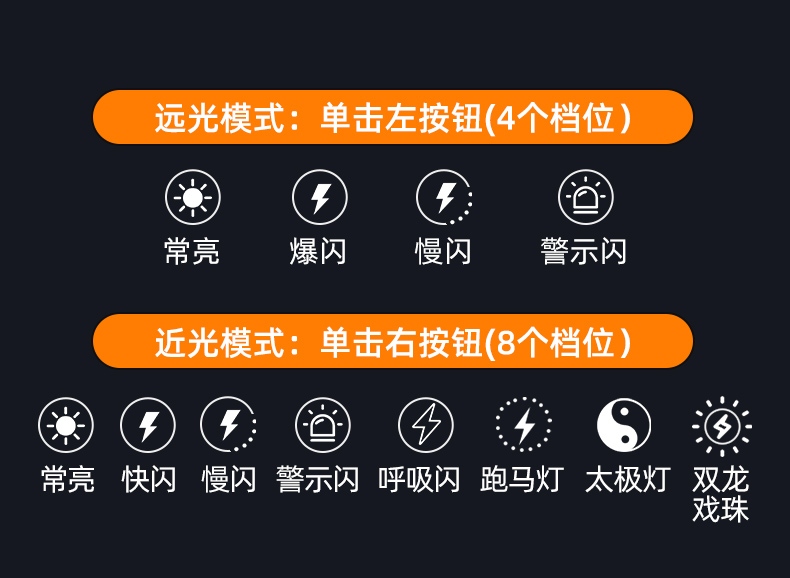 1、單擊左按鈕,擋位依次為:常量-爆閃-慢閃-警示閃-依此循環,任意擋位長按2秒關閉。