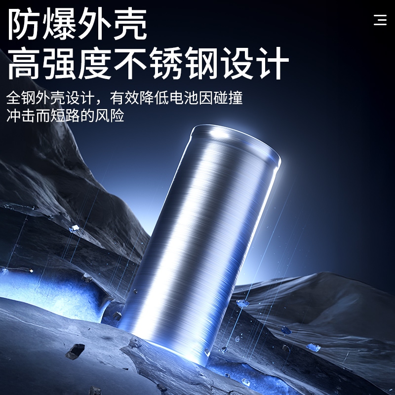 2、防爆外殼,高強度不銹鋼設計,有效降低電池因碰撞,沖擊而短路的風險;