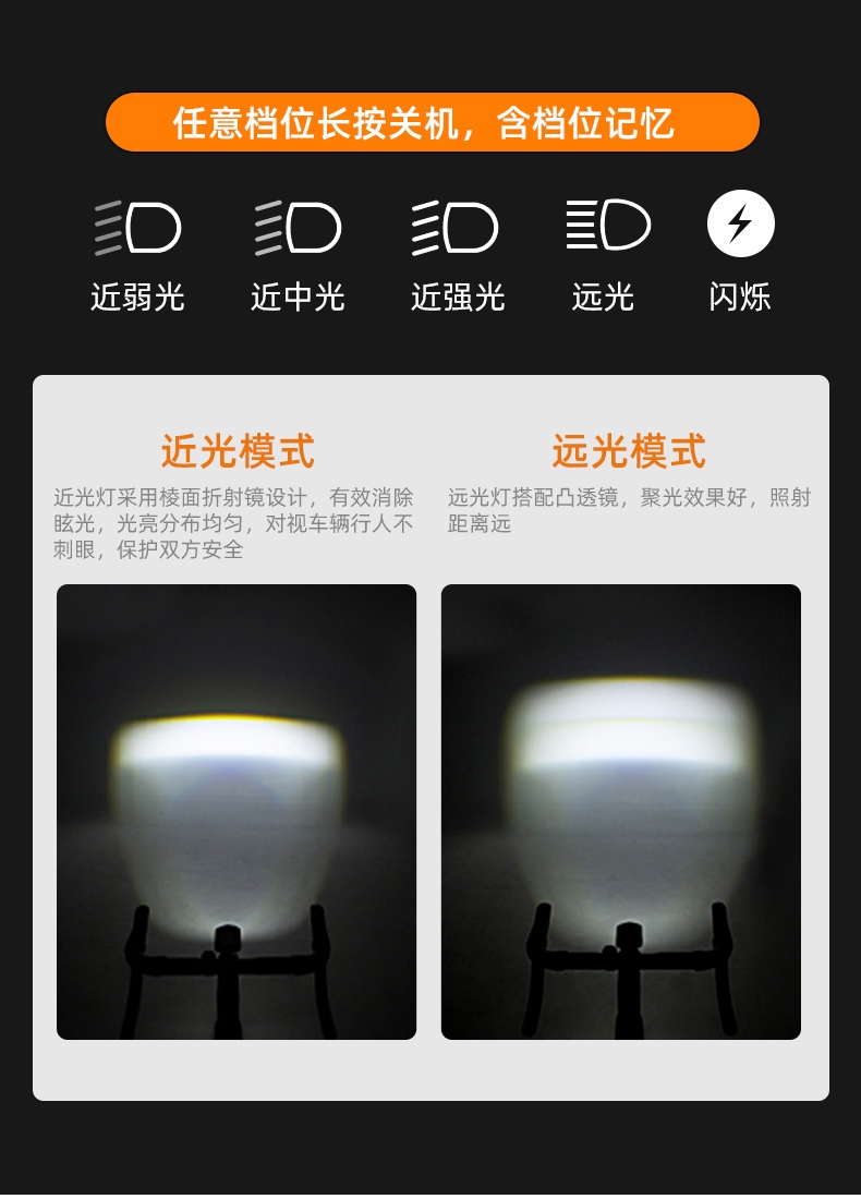 1,長按開關鍵開啟光源,檔位依次為:近弱光-近中光-近強光-循環,雙擊開啟/關閉遠光。任意檔位長按關機。燈具帶有檔位記憶功能,再次開機后為上次關機檔位。