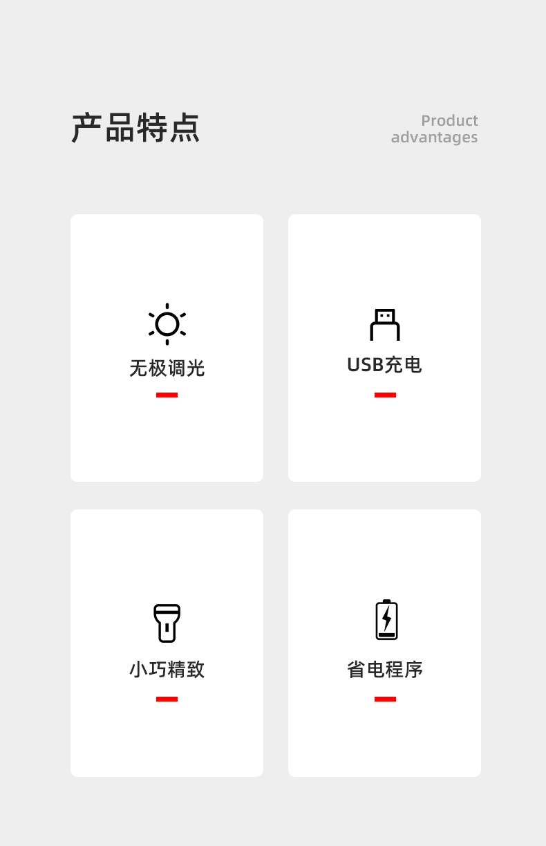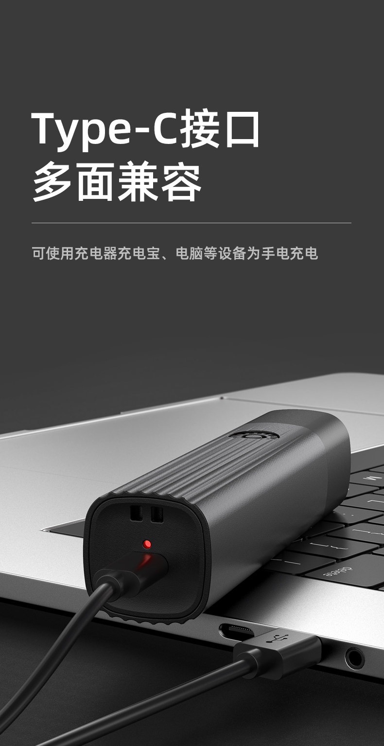 無極調光,滿足生活所需,多樣化充電,使用方便:設有type-C充電接口,可使用充電器、充電寶、電腦等設備為手電充電。設有省電程序:更亮更持久。小巧精致:外出攜帶更方便。