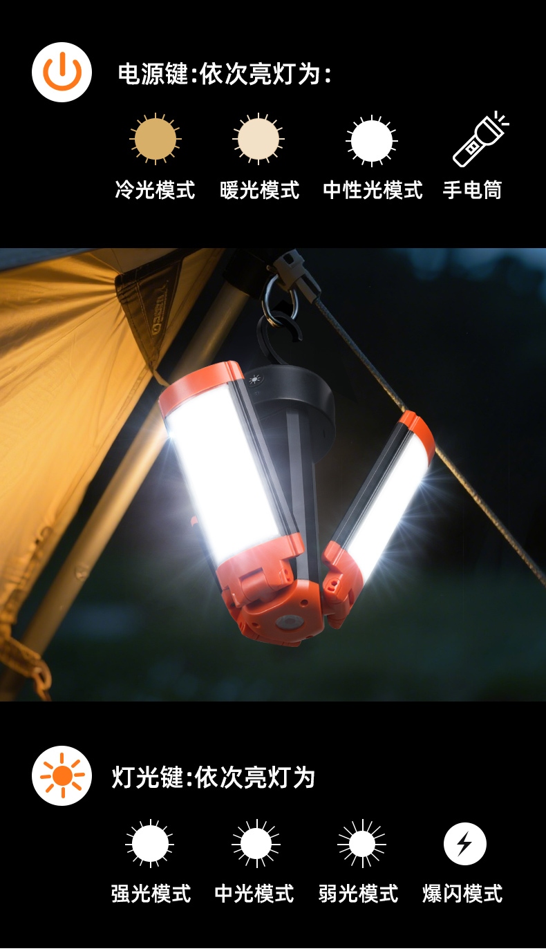 1、四模式+四檔位,從容應對各種場景,適用于多種戶外夜間環境,,動動手指即可切換;