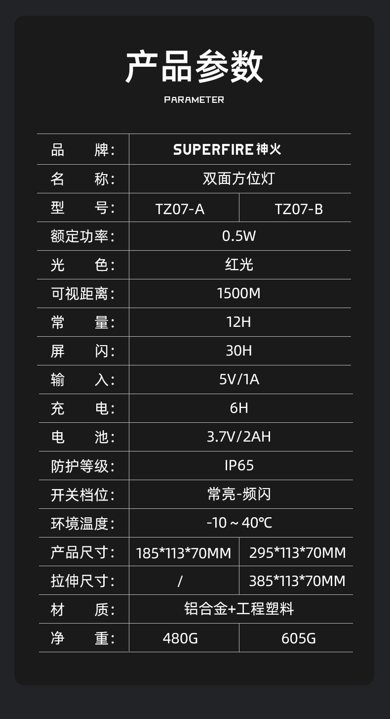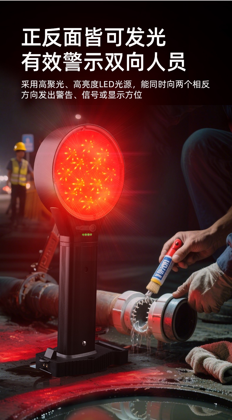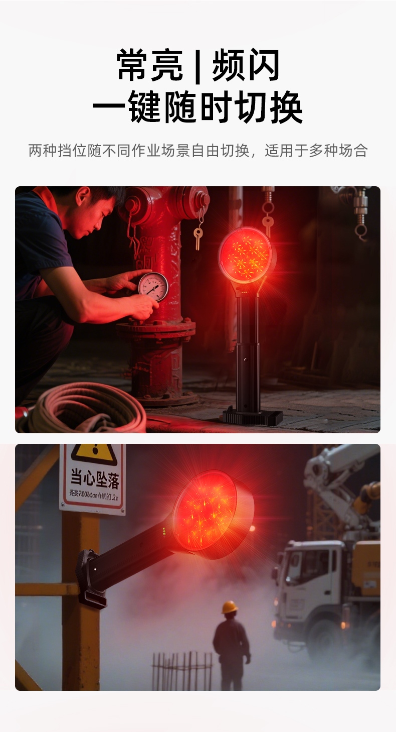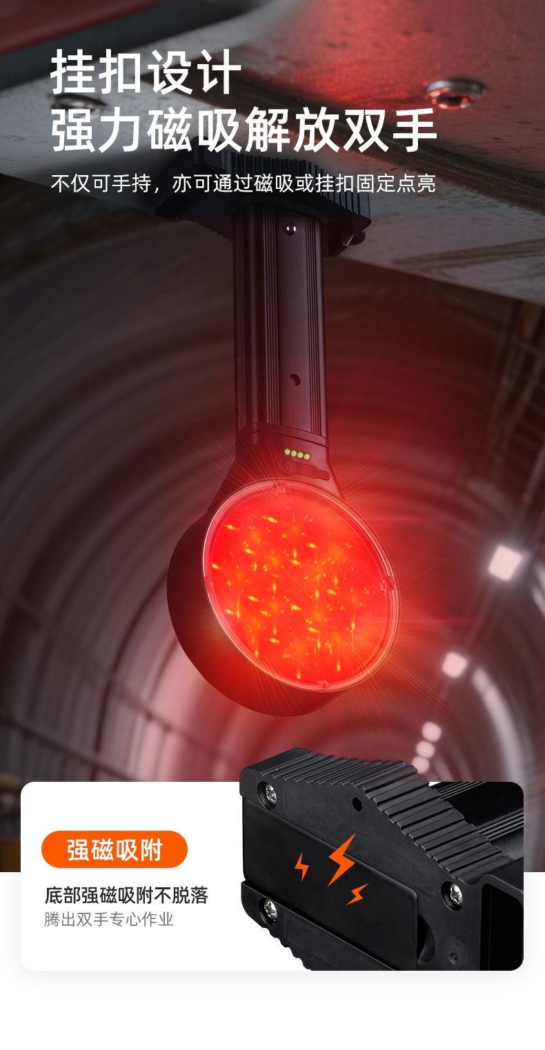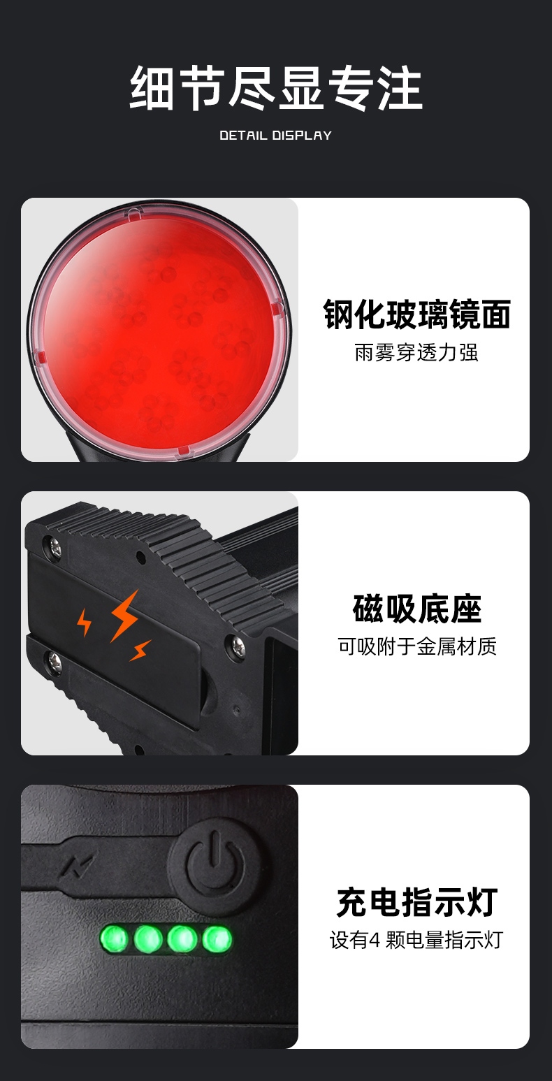 正反兩面發光,單向可視距離達1500米,燈頭可伸縮9CM,雨霧穿透力強,兩擋燈光,鋼化玻璃鏡片,可磁吸安裝,可掛裝