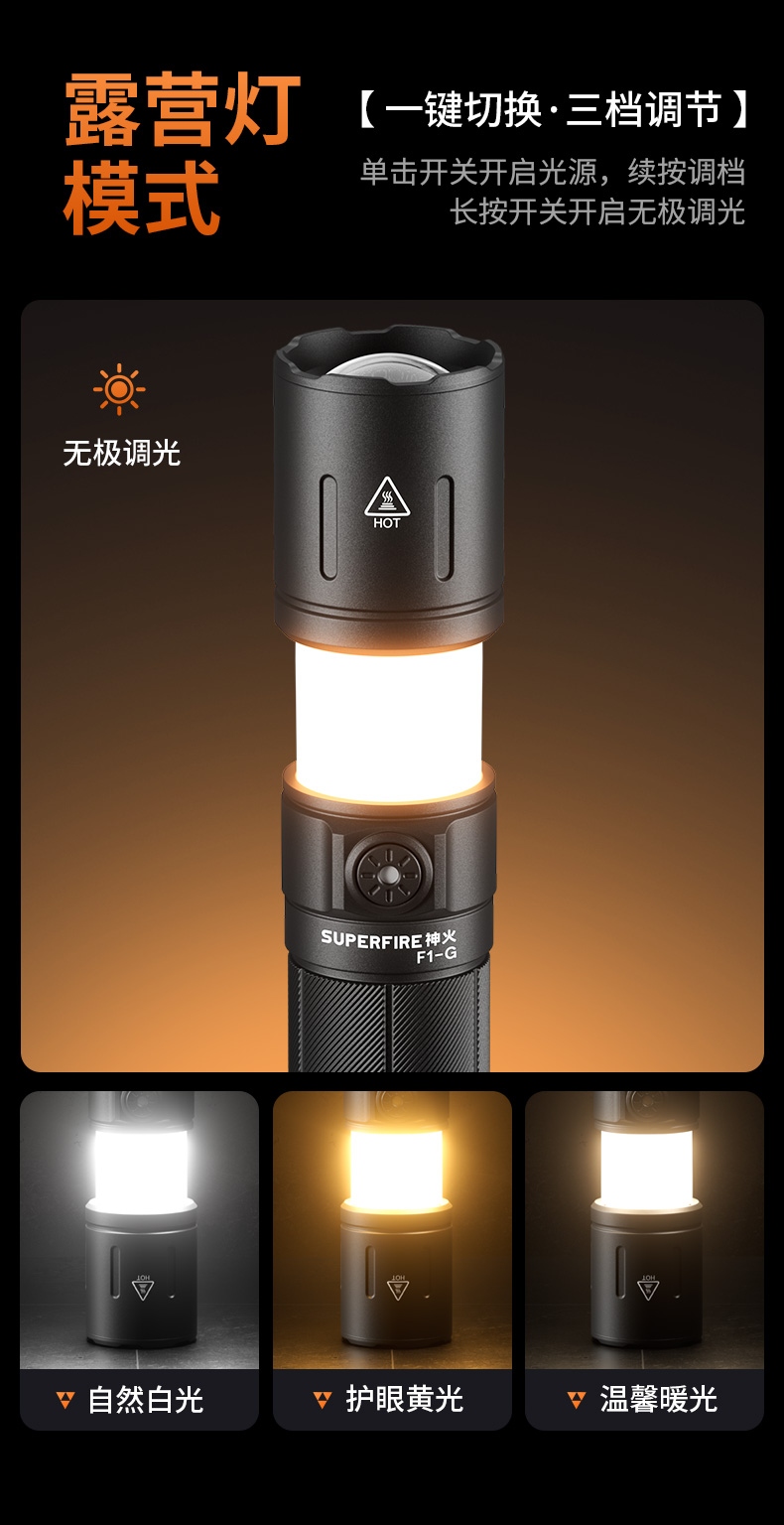 產品中心 > 戶外照明 > 手電筒 > 強光手電 > 中型手電 > SUPERFIRE神火遠近兩用露營手電筒F1-G
