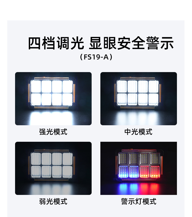 1、按壓開關鍵開啟燈具,擋位依次為:強光-中光-弱光-警示燈-關。