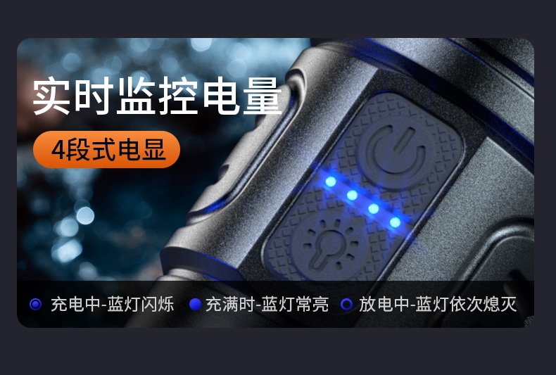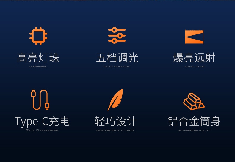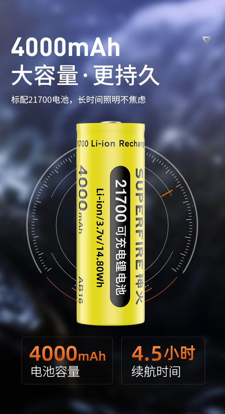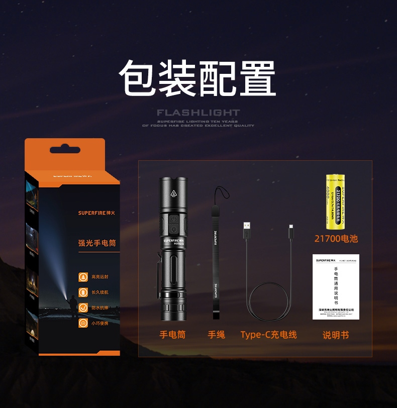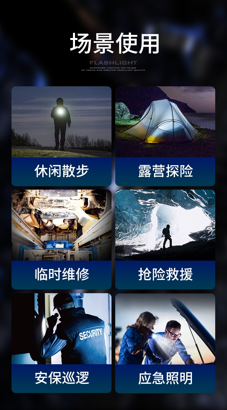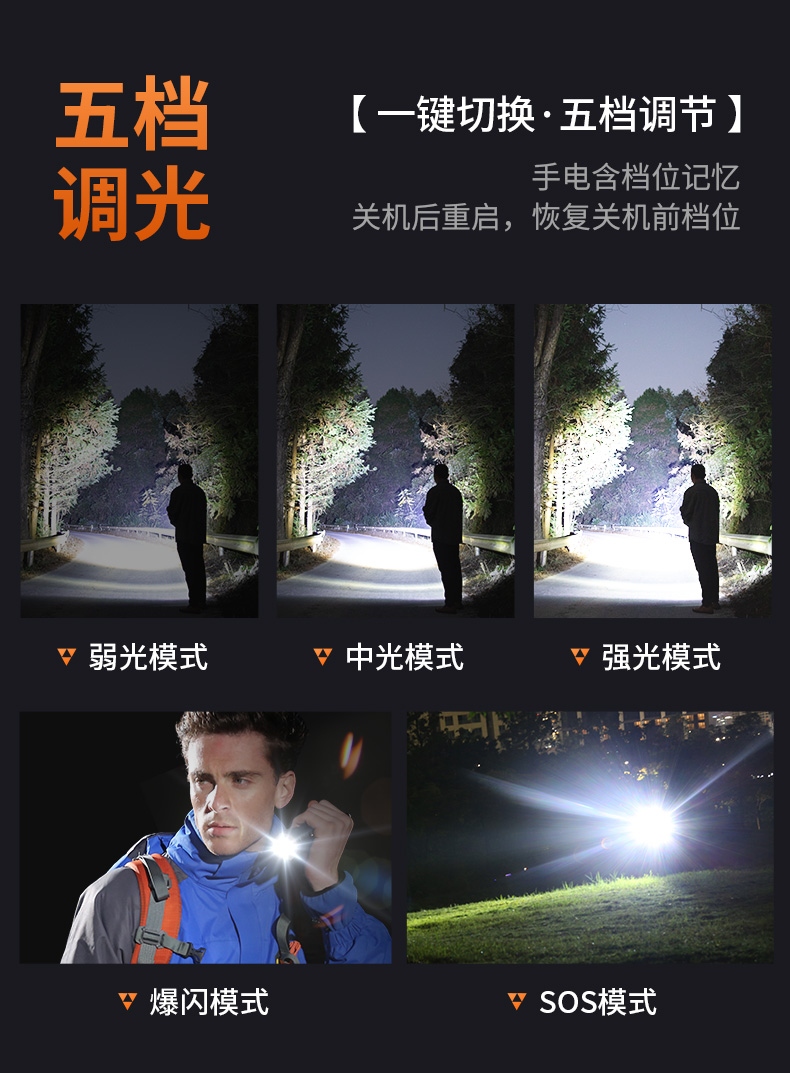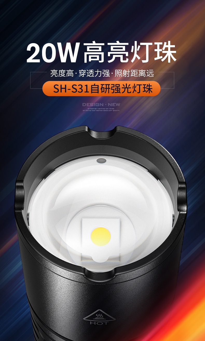 1、大功率燈芯,最高1350Lm最高亮度。 2、遠射燈珠,最大650m照射距離。 3、推拉燈頭,可實現伸縮調焦。