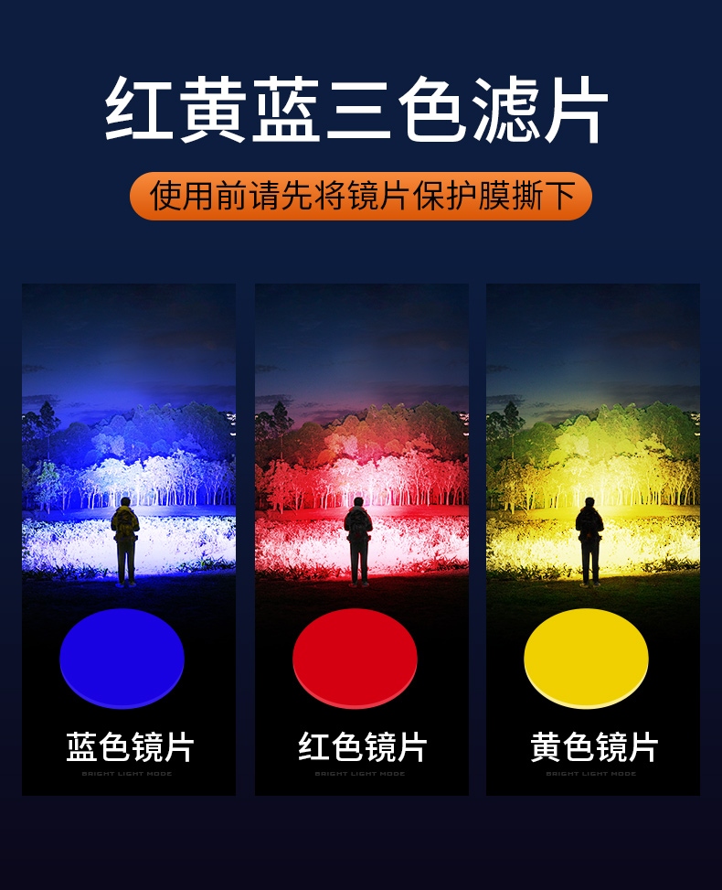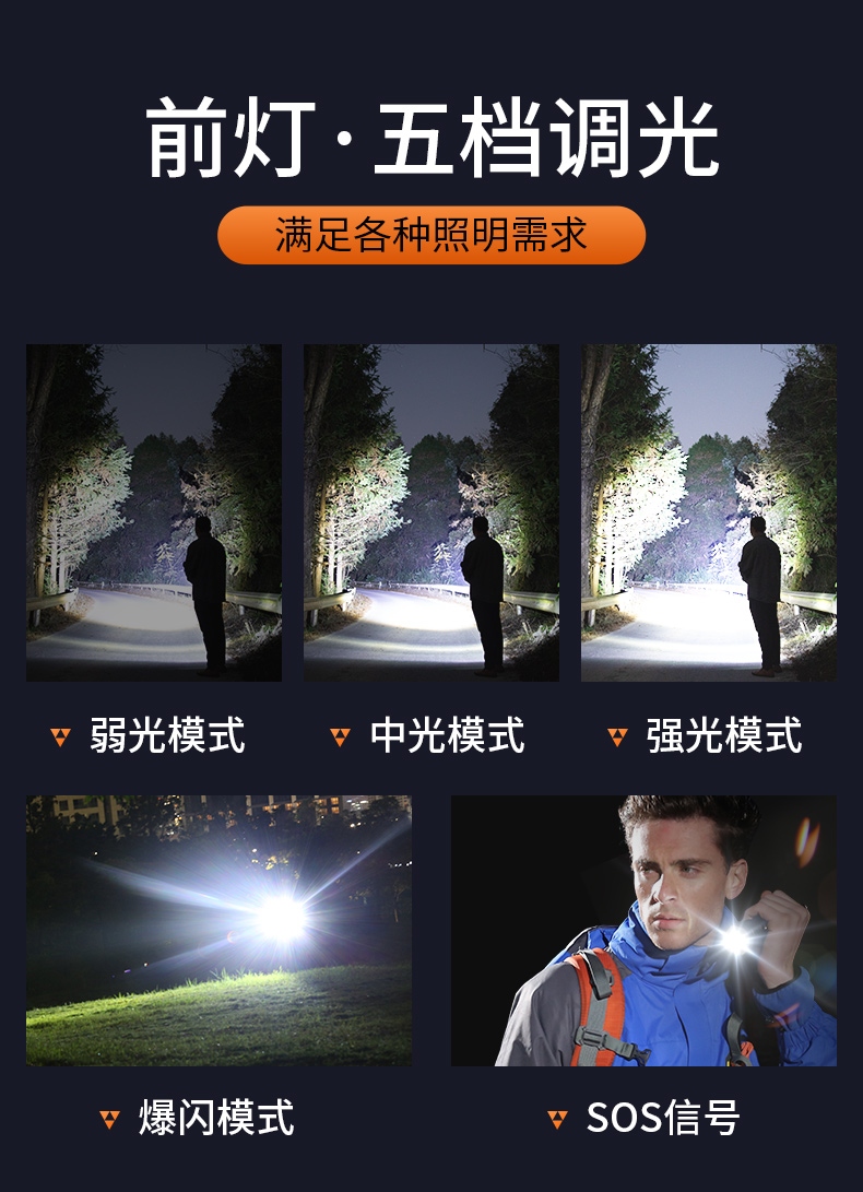 1、多檔前燈(弱光-中光-強光-爆閃-SOS)、后燈(白強光-白弱光-紅光-RGB循環-RGB定檔),可滿足多場景下的
